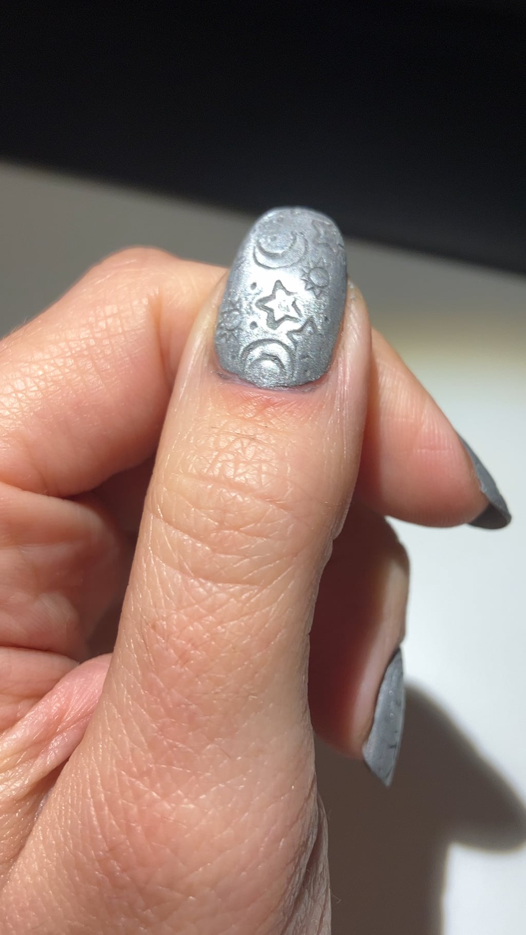 I used 2 coats of Snailworks – Metal Coat, let it dry for 20 mins, then used some metal stamping dies I had and a dotting tool to press the shapes into the polish. It was a tricky balance making sure the polish wasn’t still too wet but not too dry. Then I used the included buffer to smooth it out and reveal the shine!