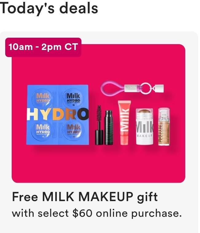 [Link](https://www.ulta.com/p/free-beauty-break-6-piece-milk-makeup-gift-with-select-60-shipped-purchase-gwp6975648213).