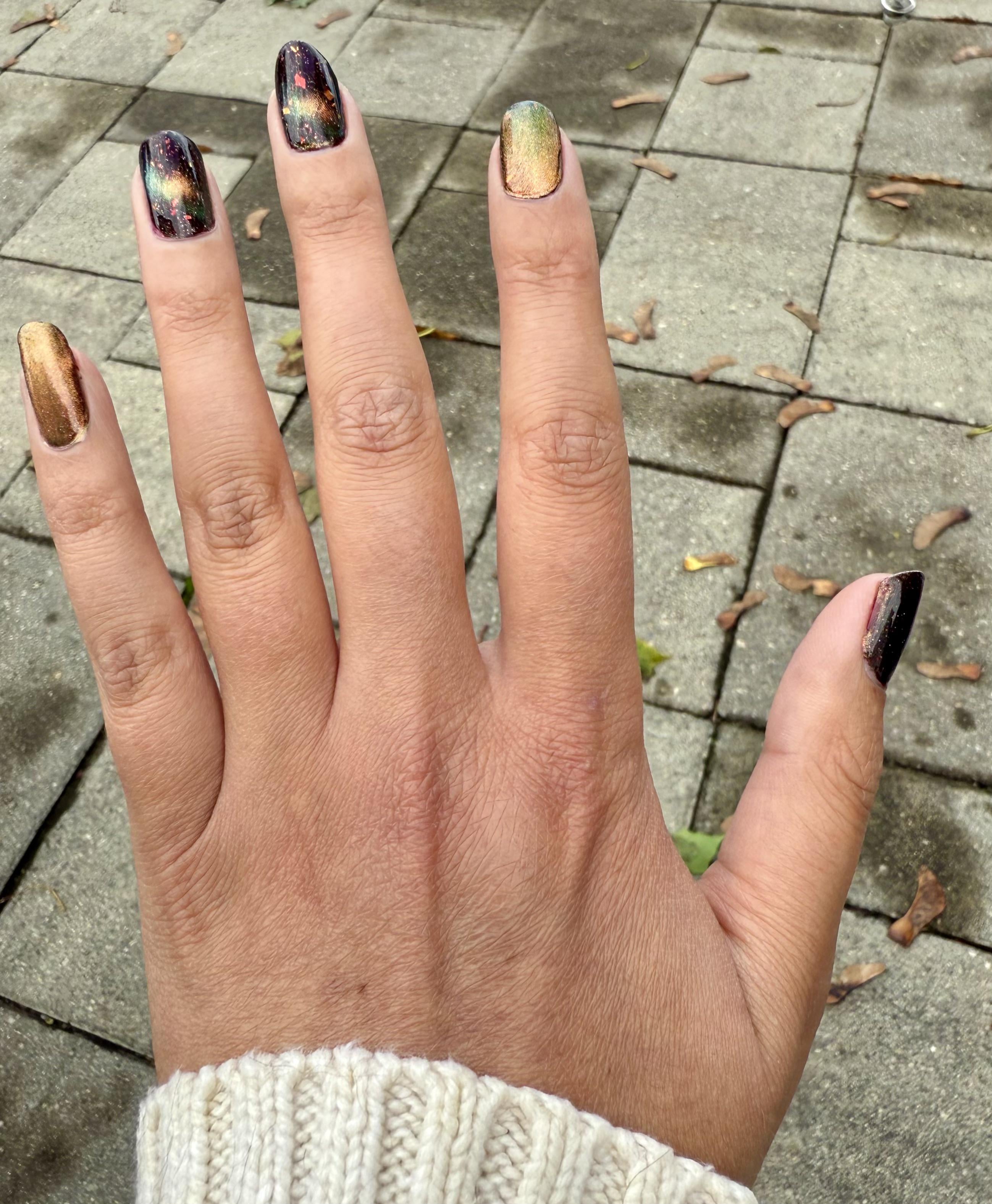 Base: Essie strong start 2 coats of Holo Taco Devil’s Advocate 2 coats of Holo Taco Feelin’ Sparks (thumb, index and pinky are a velvet magnetic effect and middle/ring are a cat eye magnetic effect Top: Mooncat Speed Demon by rustsparkle