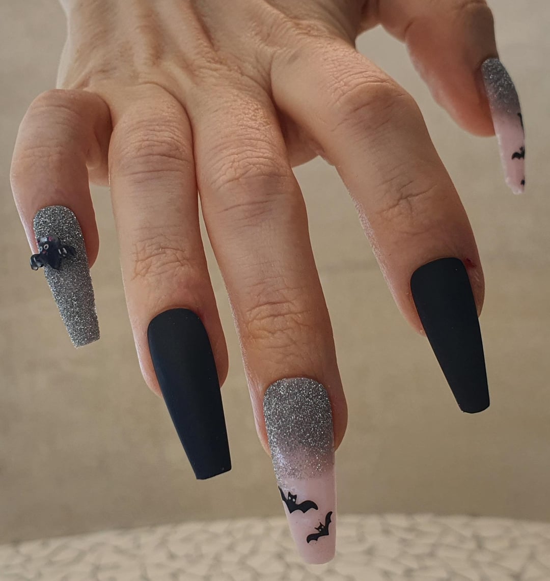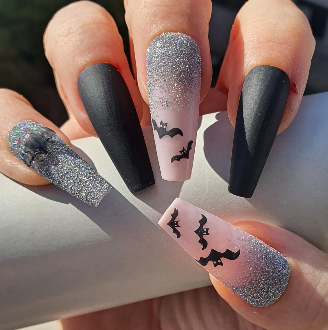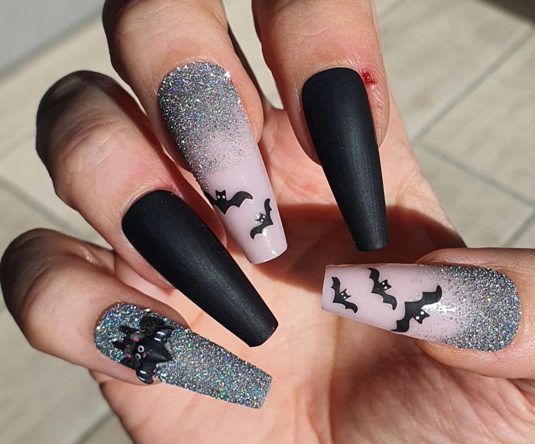 For this set, I used : – nude and black gel polish – silver reflective glitter – bats stickers and a bat 3d charm Matte top coat by Key_Opportunity_7082