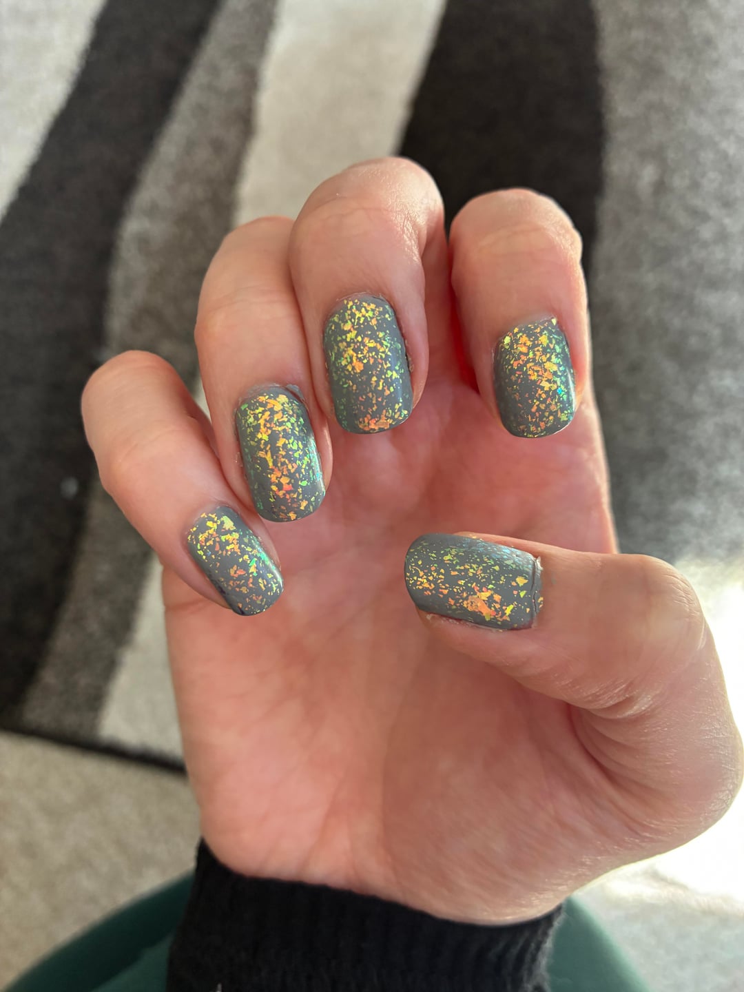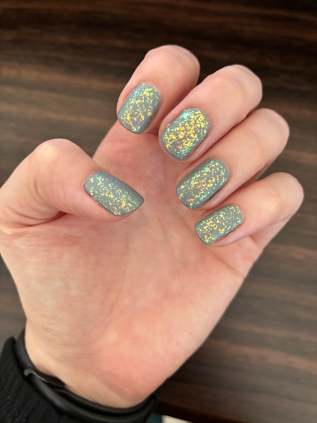 Please excuse the messy cuticles lol. But I loooveeee this topper! The asymmetrical flakes are so interesting. I put a matte topcoat on this and it gives major opal vibes.