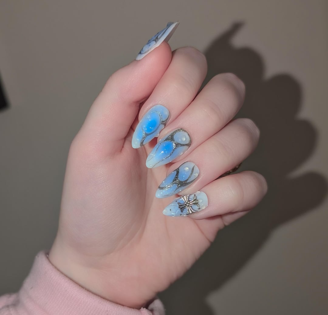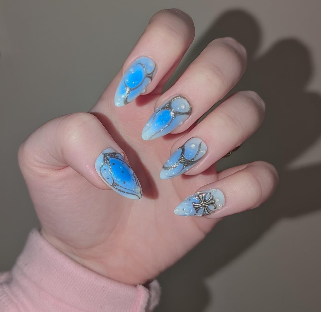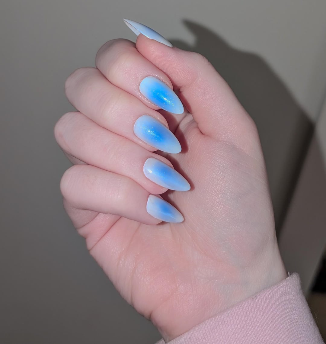 Ignore (esp the pinky) since none of these nails are my size – I didn't plan on wearing this set but since some of the techniques I tried didn't work out 100% I made them fit to my nail beds 🤣 I do like the aura and I'm excited to make more press on sets in the future! 💙