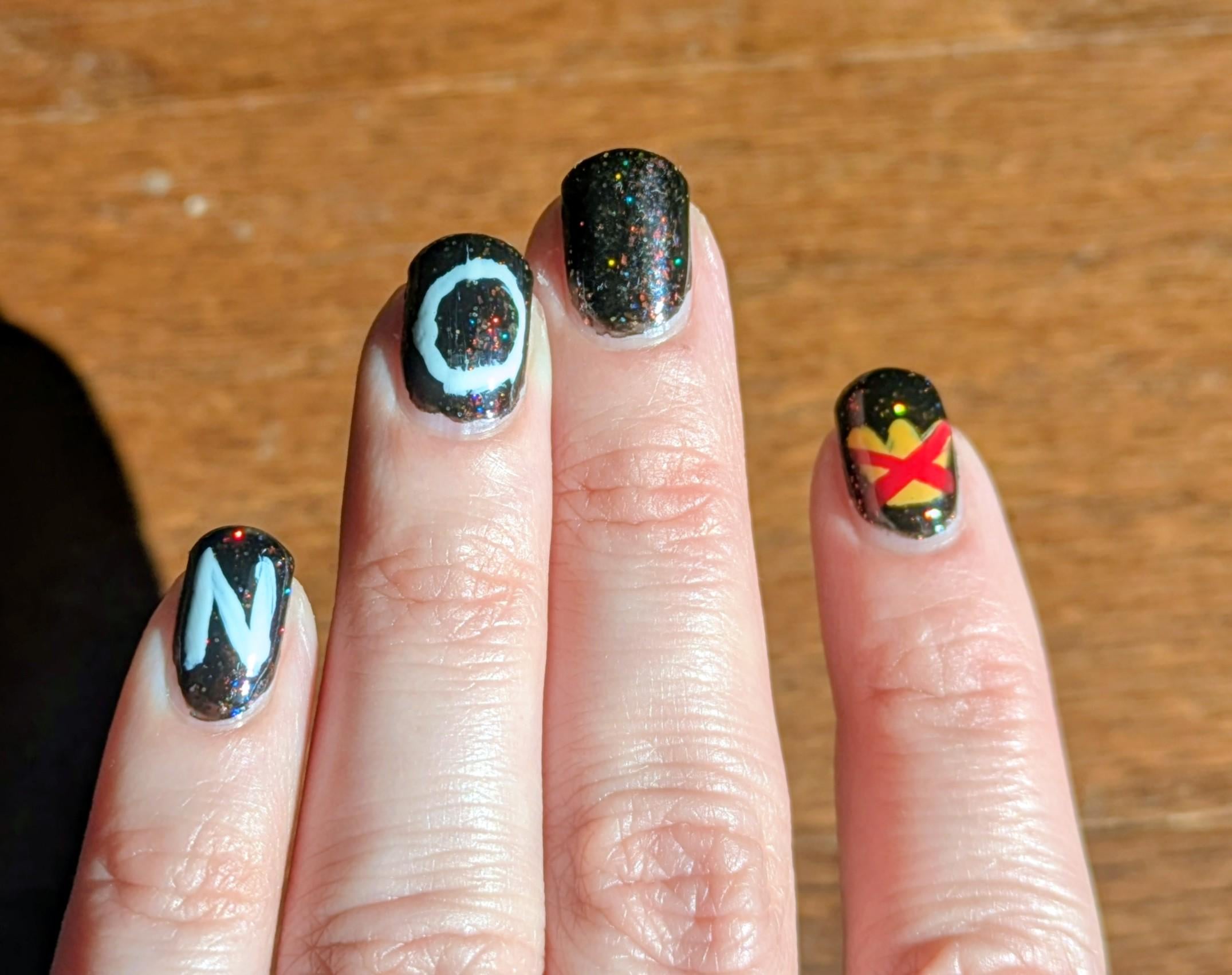 Be safe out there! Base: Essie Strong Start HT Waste of Space, SH Insta Dri White on Time, HT Butterscotch Hop, and an old SH red whose label came off. Top Coat: KBShimmer Clearly on Top by _Tamar_