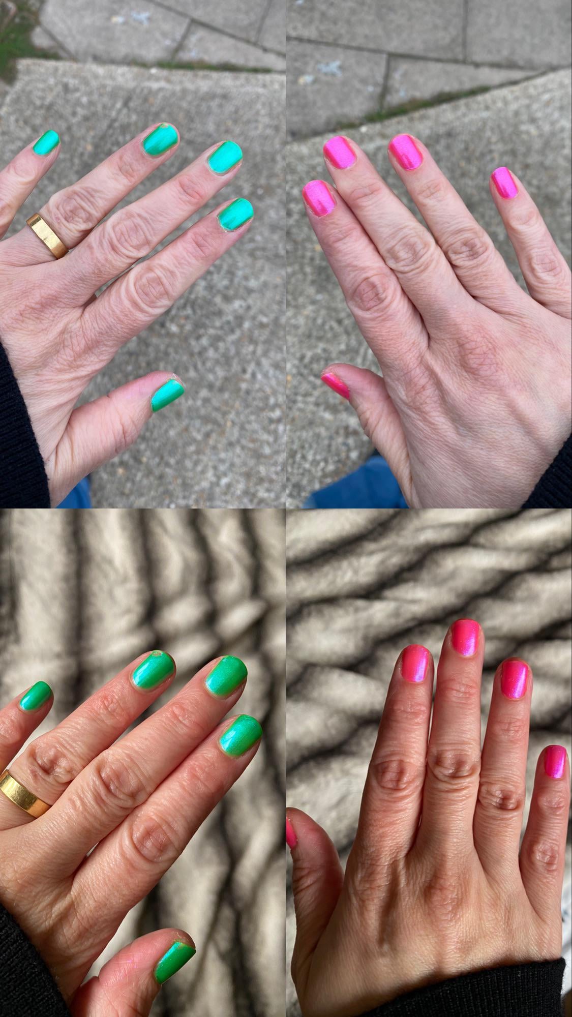 It occurred to me recently life is too short to have the same colour on both hands. For work I try to be a little more subtle and keep it same tone/hue but I am out tonight so no regrets!