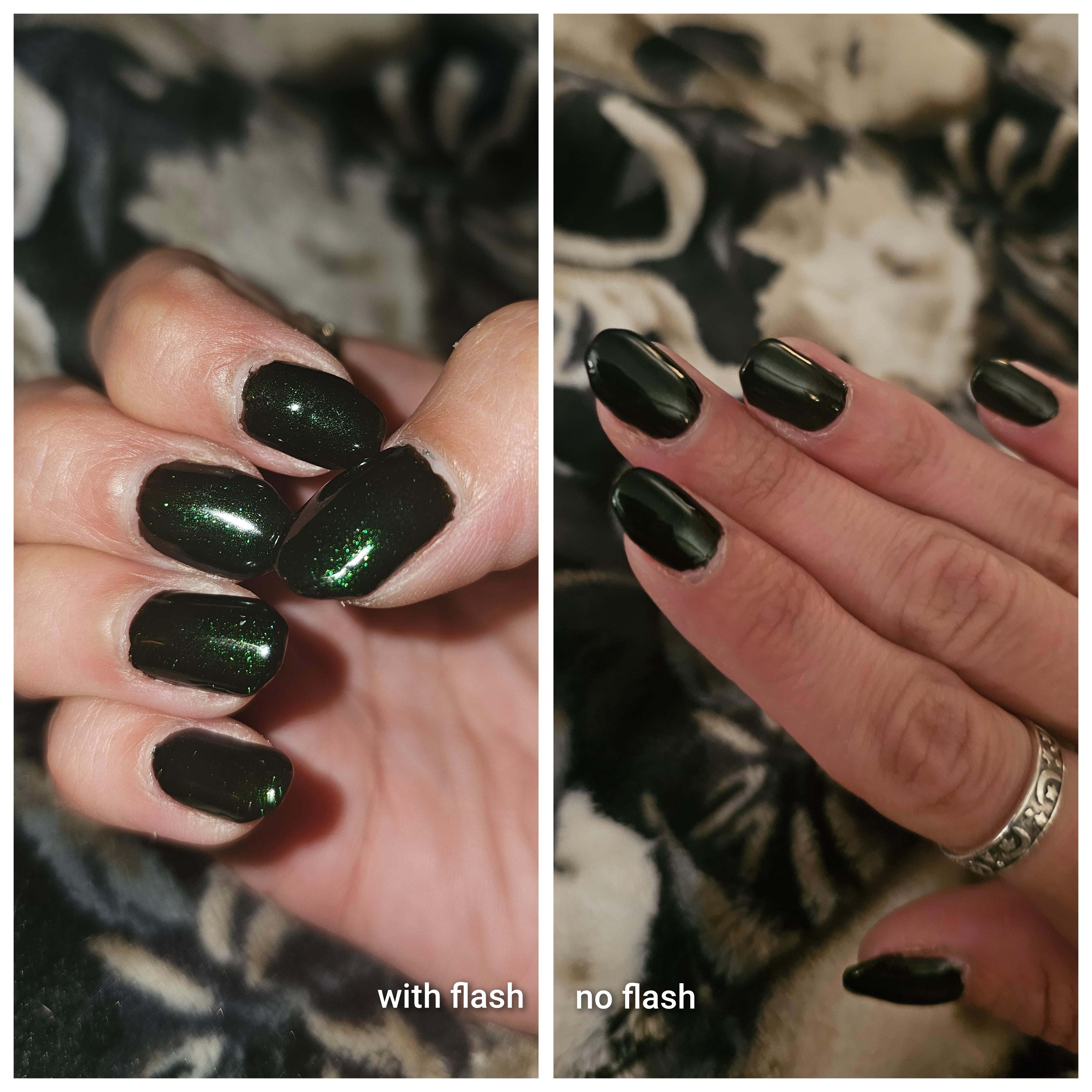 2 coats + Essie gel setter top coat. Appears black away from light, so it doesn't feel like a holiday color as it can look in a flash photo, which I like. First time using this color, formula went on smooth and was on the thicker side.