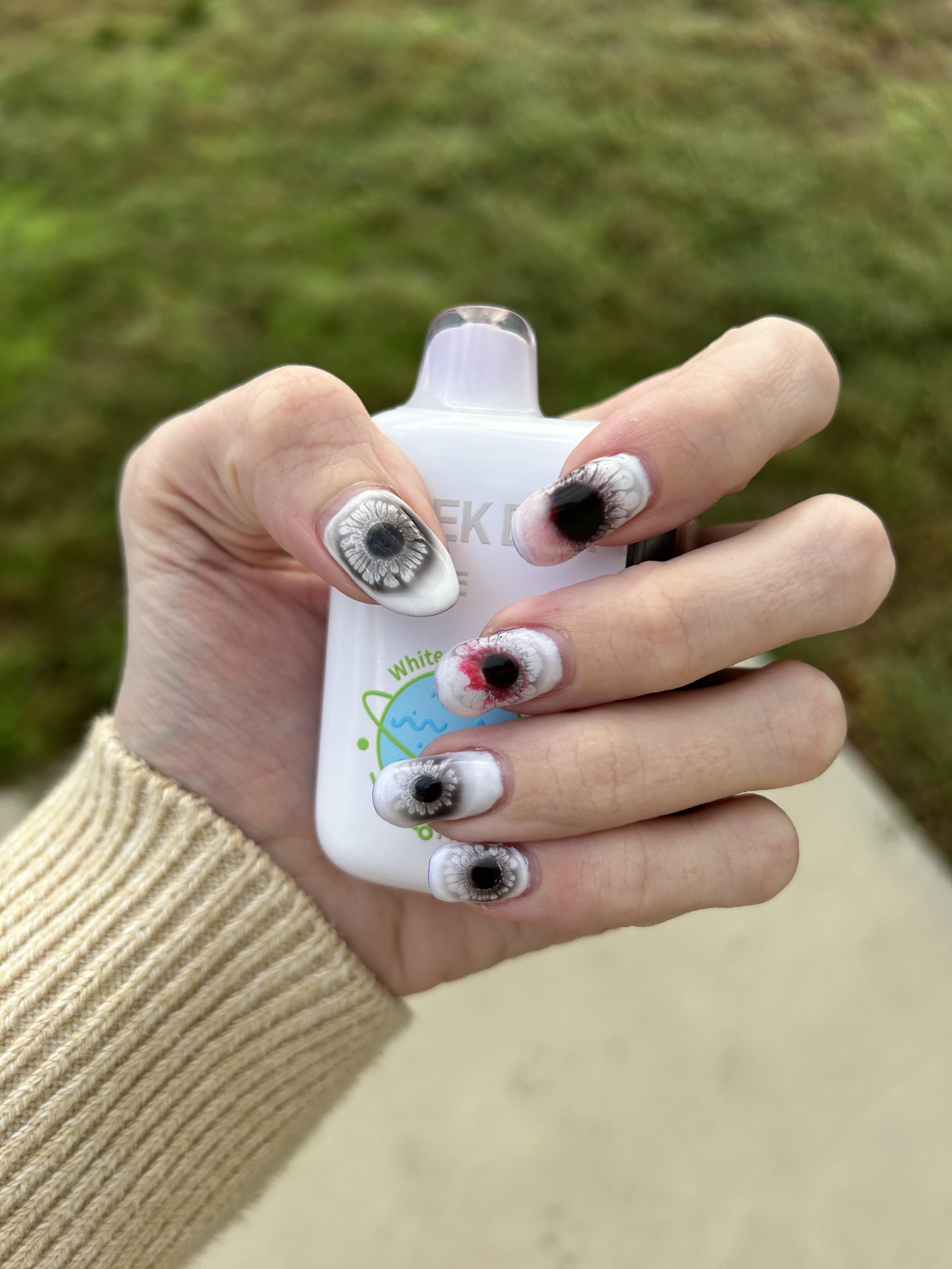 I saw Emily Susannah try this on YouTube (I’ll link the video in the comments) so I decided to try it too! I painted the nails white and cured, then put on top coat (don’t cure), drop one small drop of black (or color) polish, then dip my metal dotter tool in rubbing alcohol and gently tap the dotter to the center of the color drop. The alcohol will cause it to bloom for a short time, and this was the effect!
