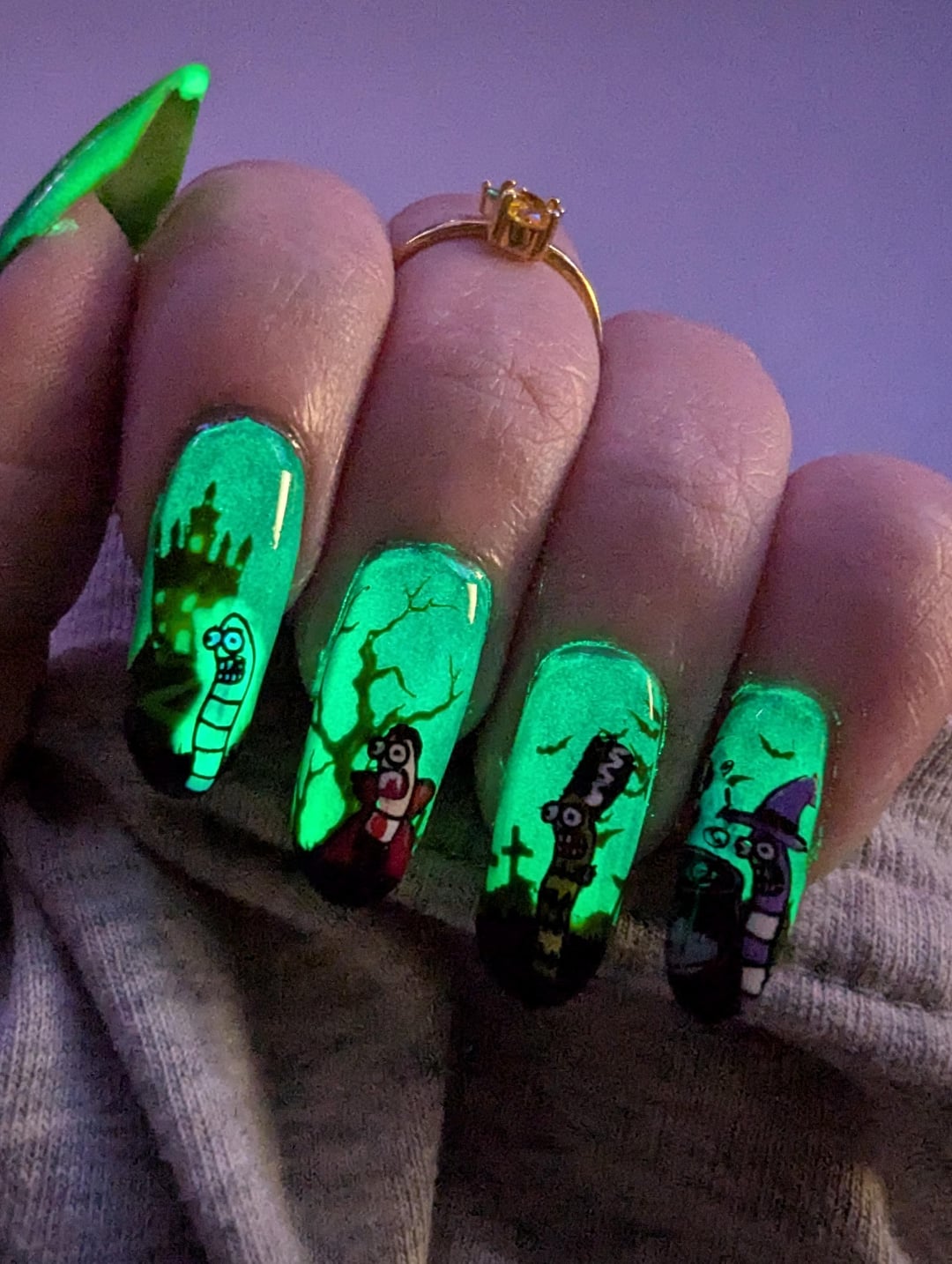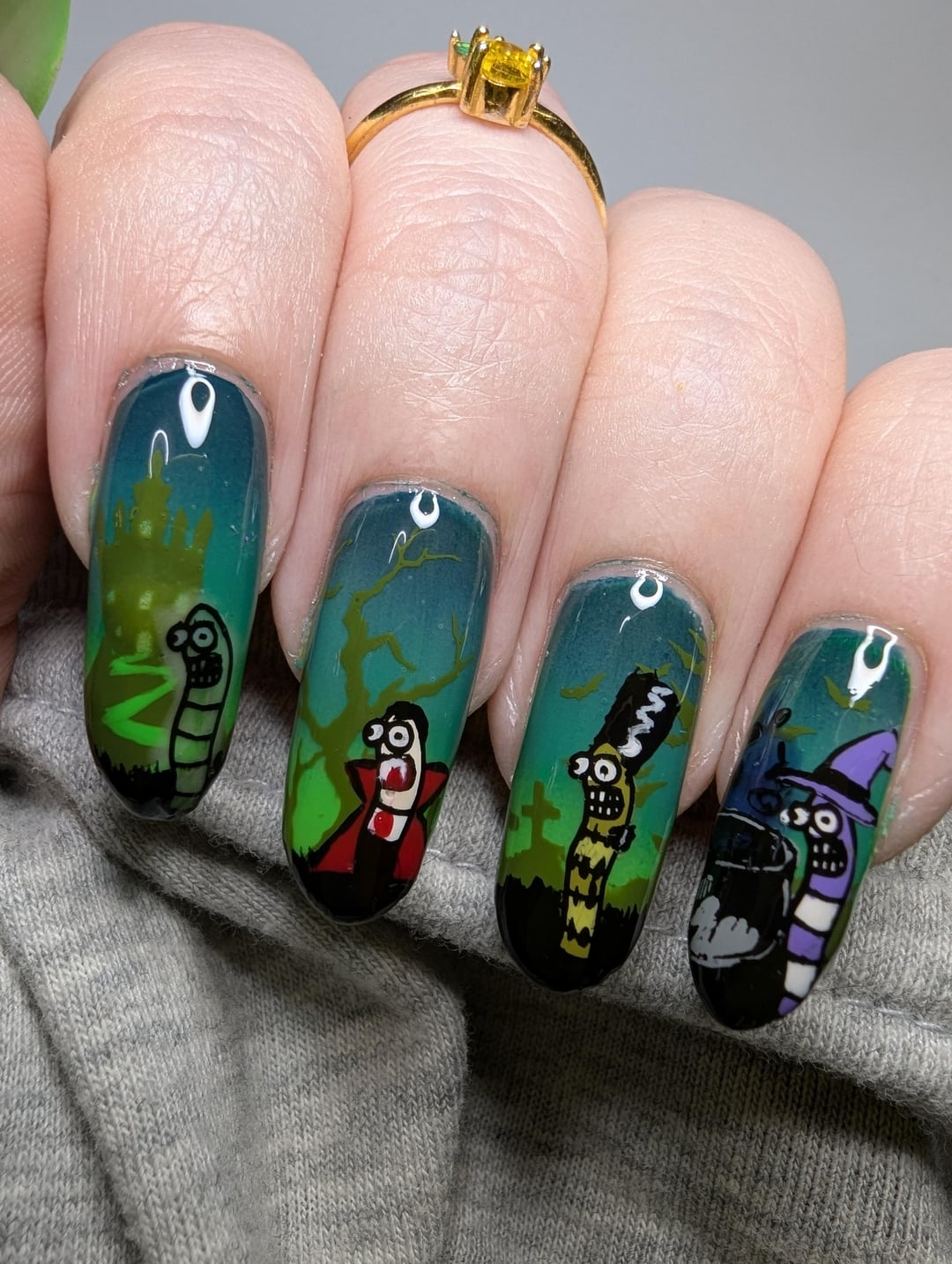 Linry on October 19, 2025 2:06 pm They are so stressed Products used: Top Coat: Seche Vite Base coat : Home made peel off base, seche clear Holotaco: one coat black, duct tape grey, glow in the dark taco, not pressed, born ugly, devils advocate Zoya: Hannah, tommy, danica, cecilia La colors : oasis, blue moon Sally hansen : delicious!, go ahead drool. China glaze: left my heart in havana Starrily : Immortal jelly Color club: in the buff Cirque colors : kushy Saviland : Green h07 Moyou london: halloween collection – 13 Kads : halloween 006, 019, 004 Stamping Polish is from a brand I no longer support because they steal swatchers photos. Born Pretty bp-tvs03, bp-tys01