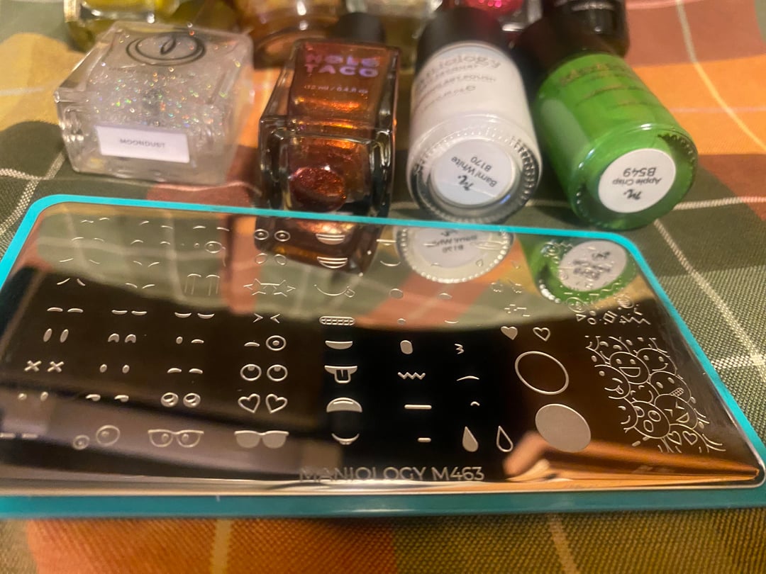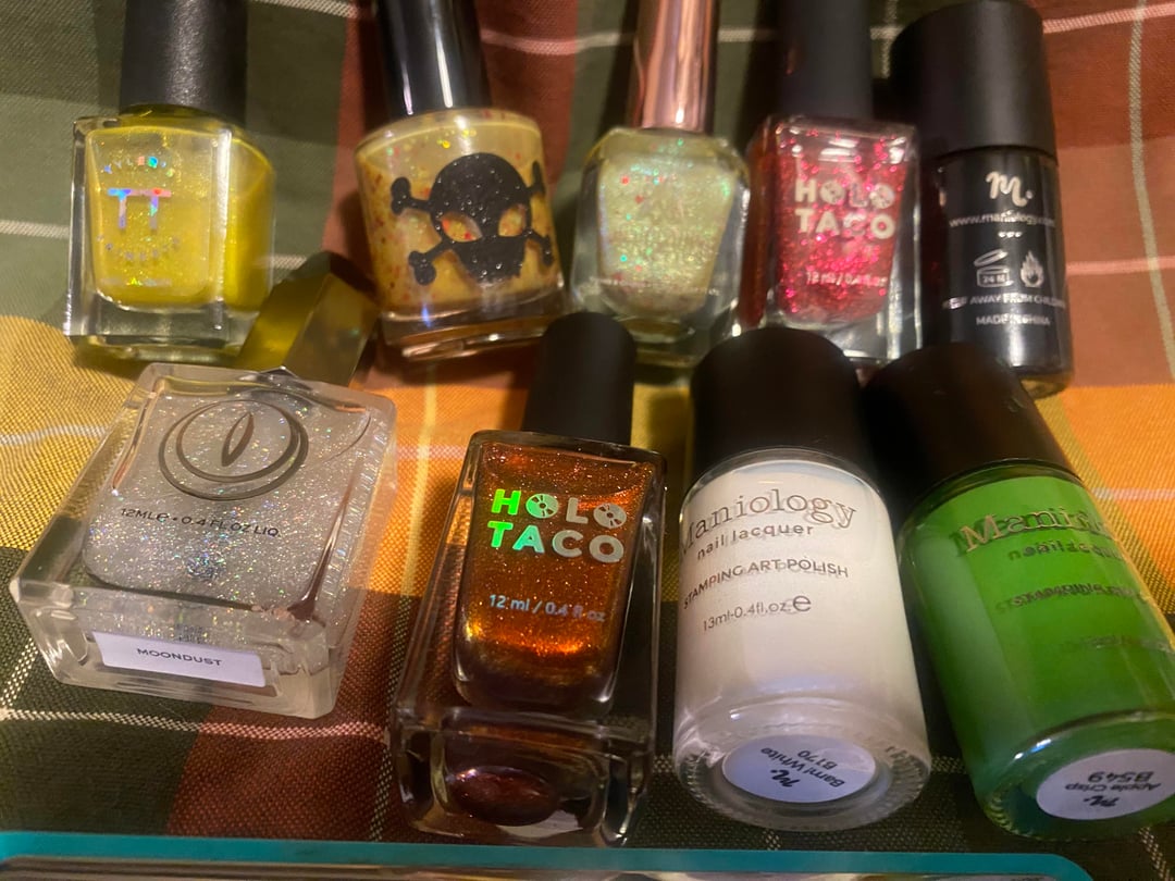 All the fingers have frog 🐸 faces, with a yellow background. Polishes used: Clionadh: Sundew (PPU 01/24). Tyler’s Trinkets: A Thousand Yellow Daisies. Paradox Polish: Girl With the Most Cake (PPU 10/23). Mooncat: Moondust. Holo Taco: Red Flake Taco and I’m Rover It. Maniology: Apple 🍏 Crisp, Bam White, and Straight Up Black. Plate: M463