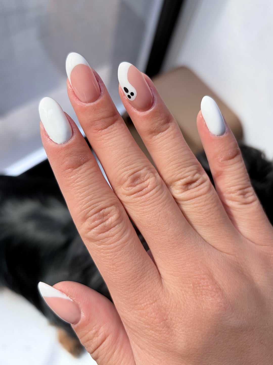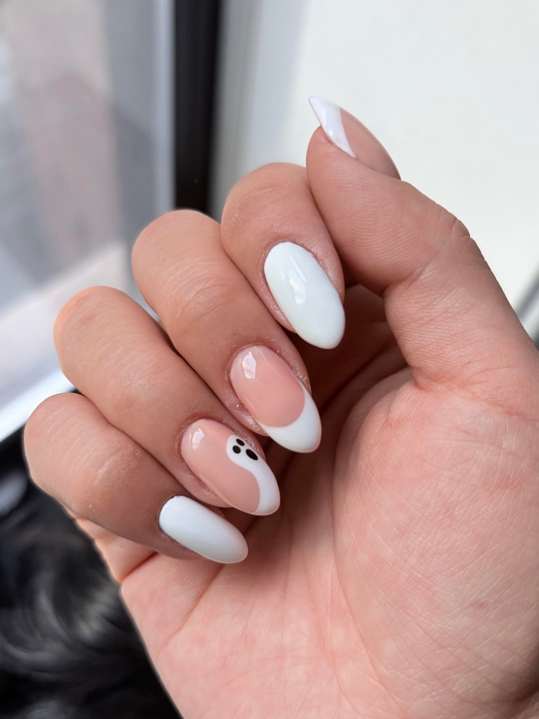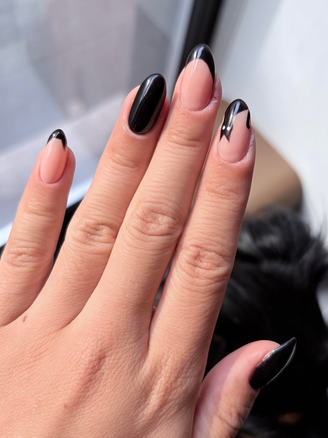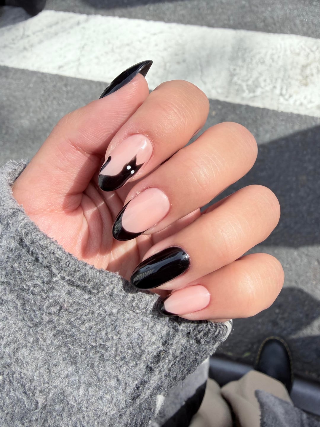 Did a simple and cute Halloween set this time! Please excuse my crusty cuticles🥲 also the black pinky nail is supposed to be cat ears, not a French tip… but it looks kinda like a wonky French tip instead😀 by JustLivinLifeIGuess