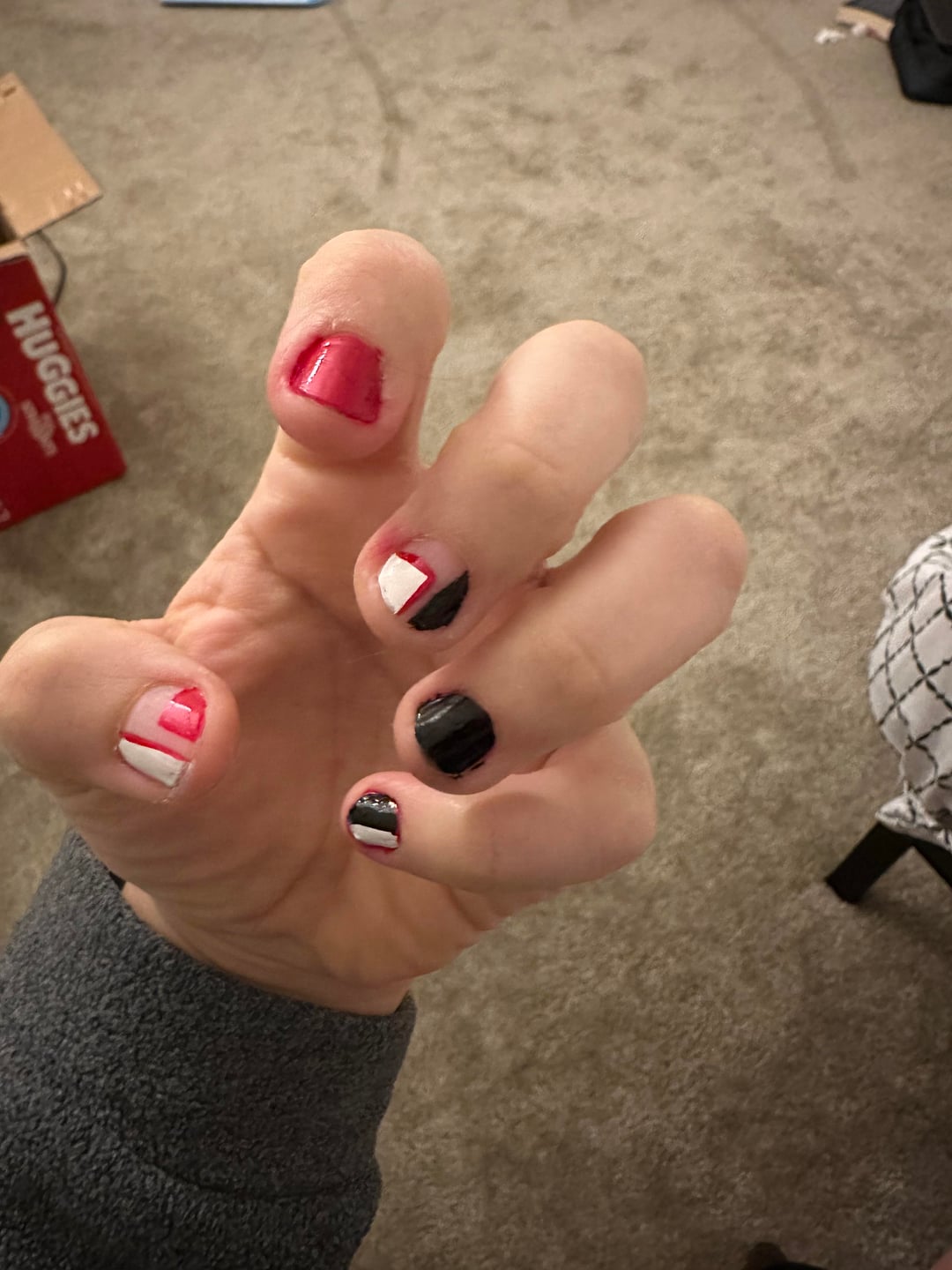 I have a baby girl that sporadically goes to sleep or wakes up so I want my nails to be completely clean and taken off fast so I just do all of this with regular nail polish