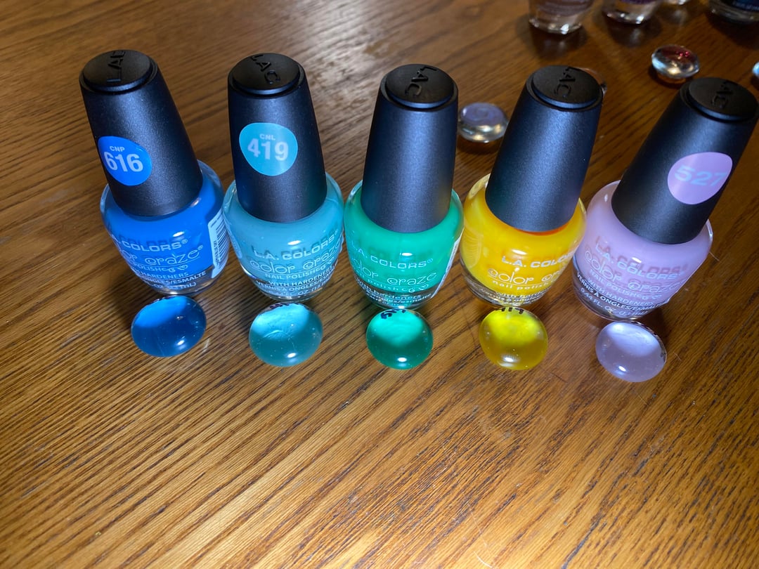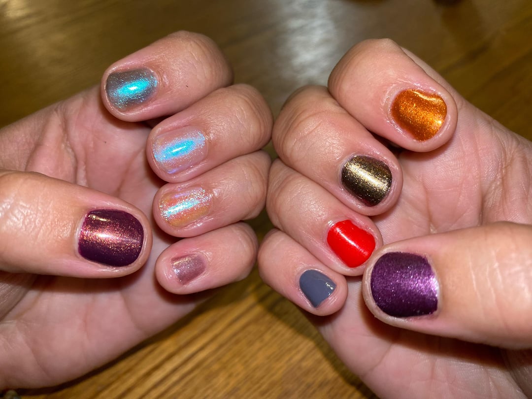 flawless victory (left thumb), mermaid charade (left pointer), born a unicorn (left middle), glass ceiling (left ring), shine baby shine (left pinky), rustic caramel (right pointer)