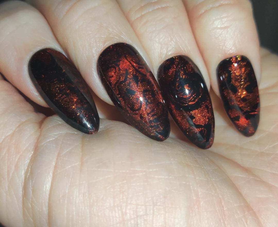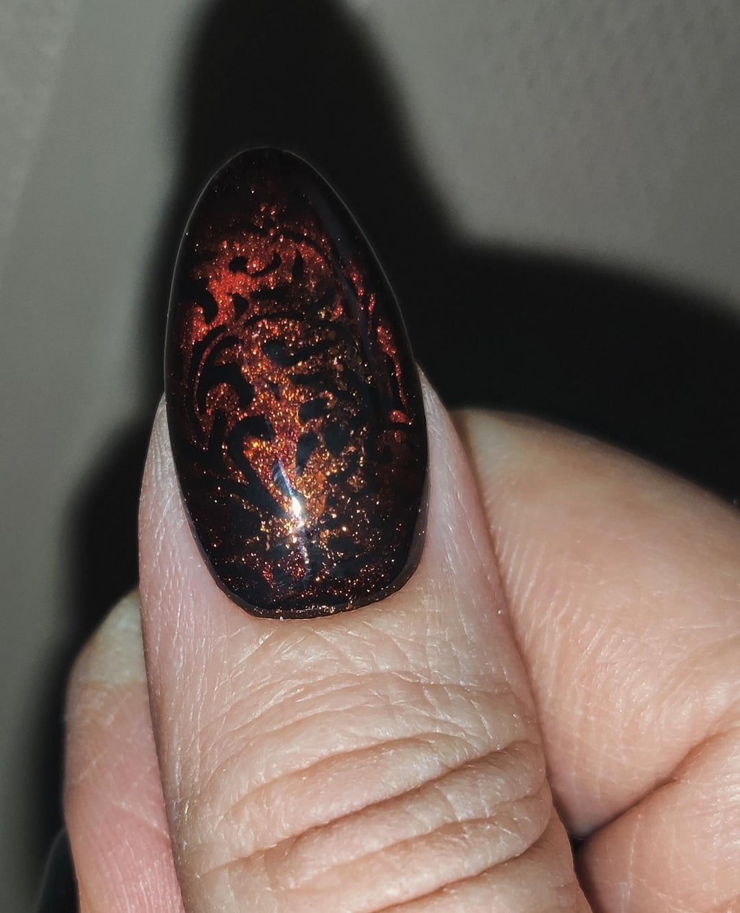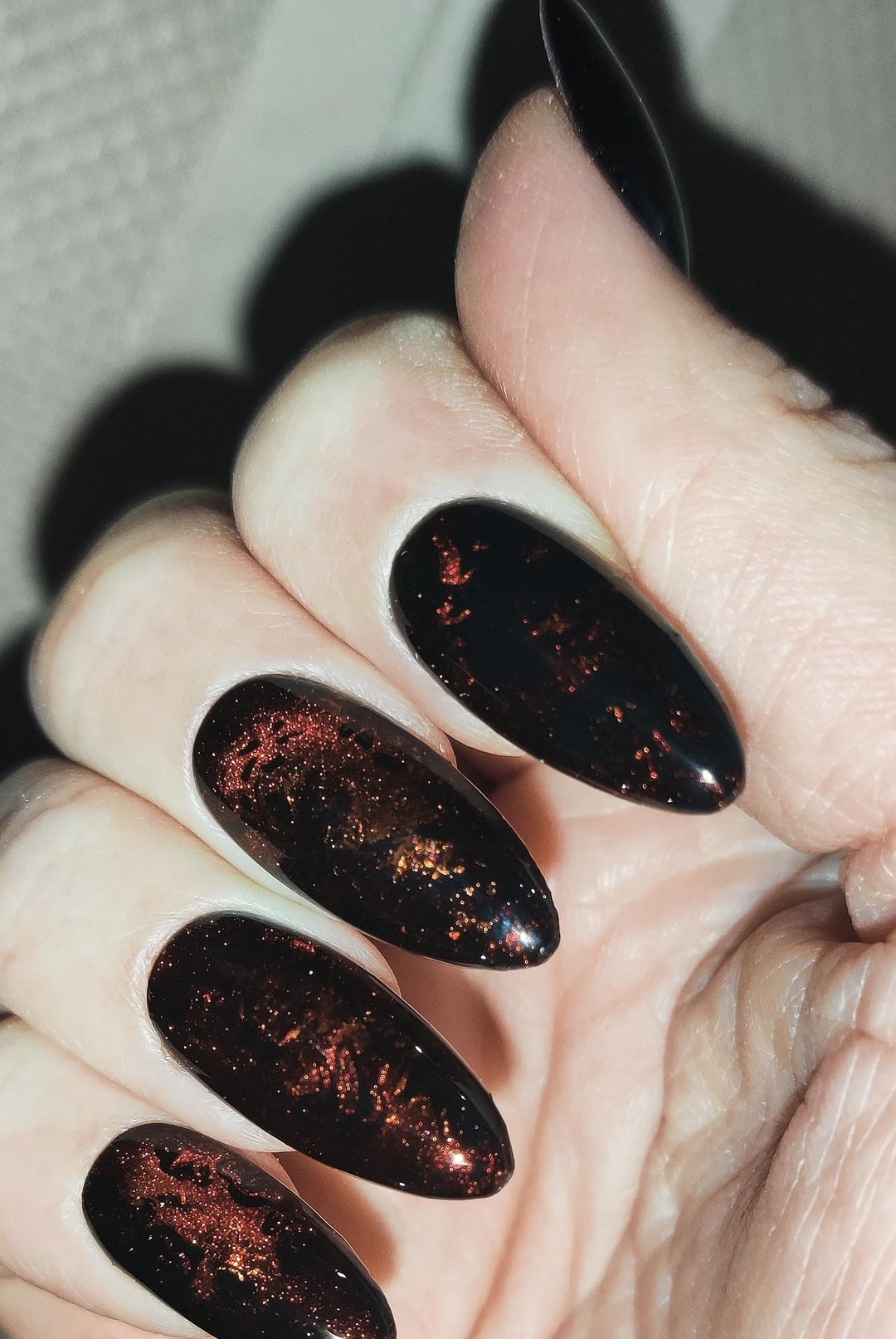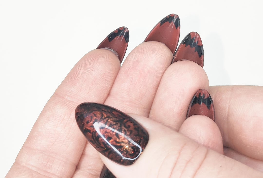 The way they shimmer makes me think of red amber. And yes they have tiny bats underneath 🤣 I think I like them enough to consider putting this particular design in my press on shop once I open it. What do you think? by Clawtelier_pressOn