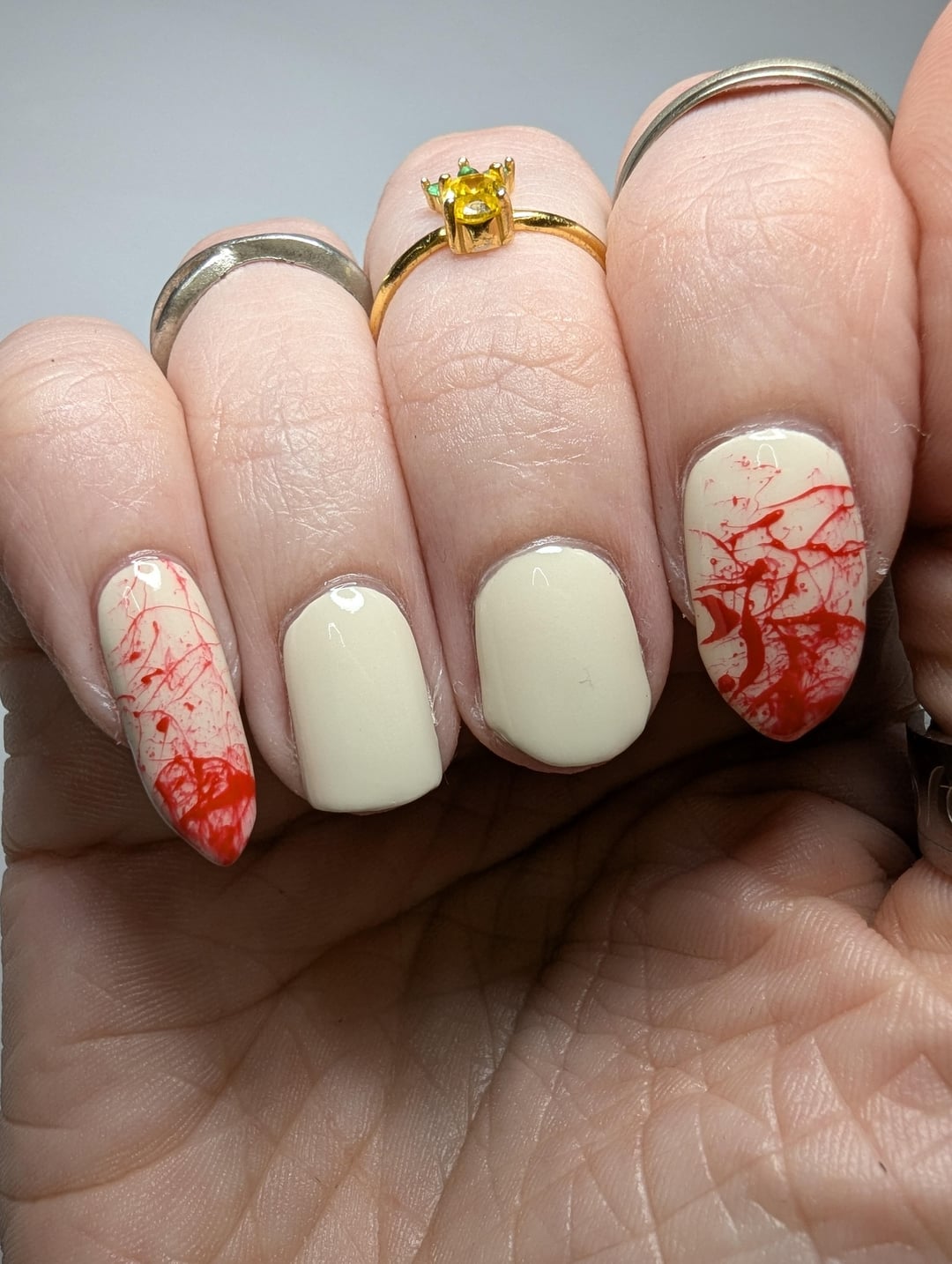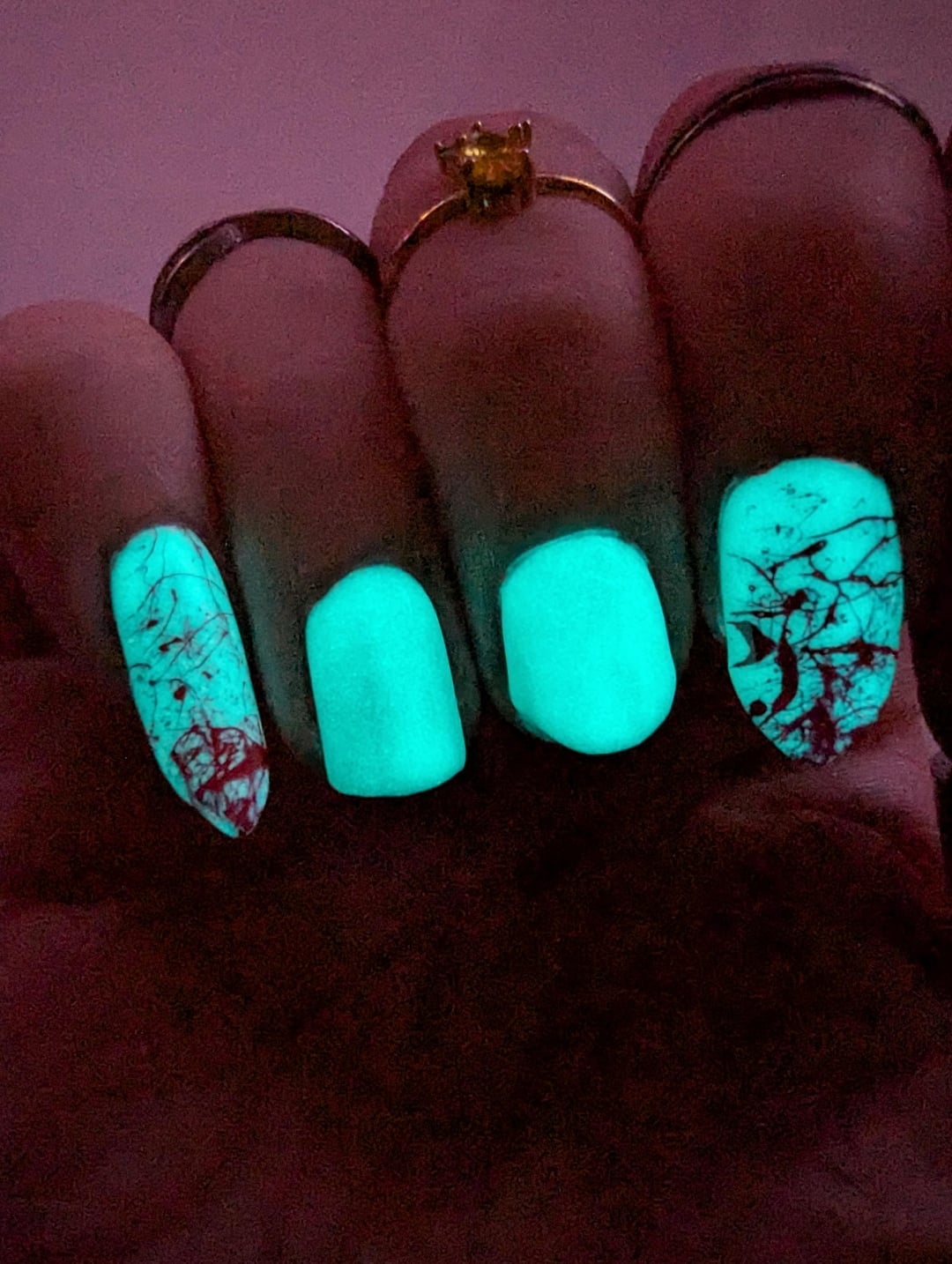 Linry on October 22, 2025 2:07 pm Products used: Top Coat: Seche Vite Base coat : Home made peel off base, seche clear Holotaco: ivory tower, aqua glow in the dark taco Zoya : sooki