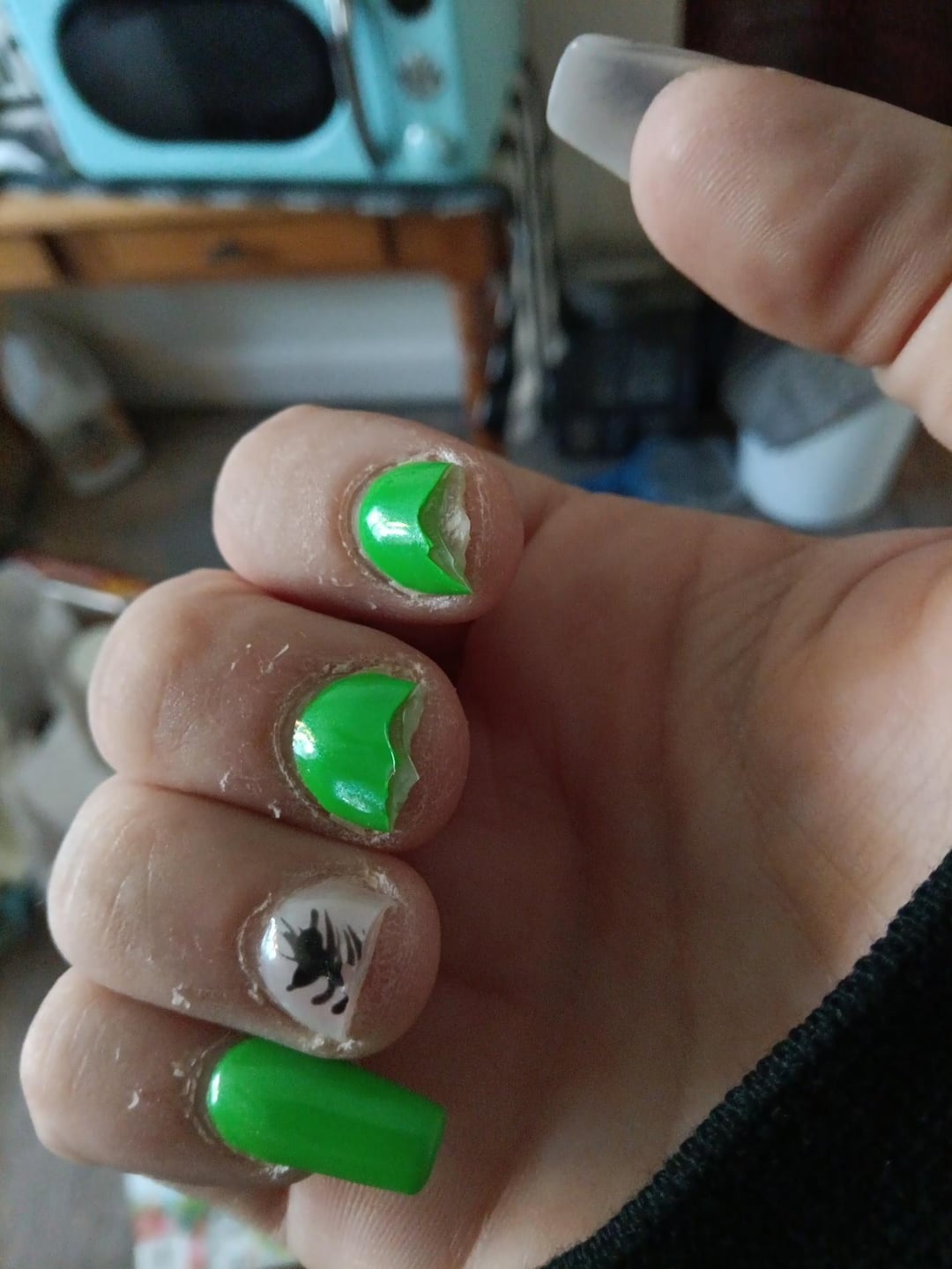 I'm new to having nails so I'm still getting a feel for what they can and cannot take. I was so sure that work would take them out, because I work at a grocery store and do a lot of heavy lifting and handling awkward objects like 40 packs of water and cases of Pop. However, it was opening a cardboard box of cat litter that did them in. Luckily it happened on my day off and I was already planning on getting a fill later this week so I was able to get them fixed immediately.