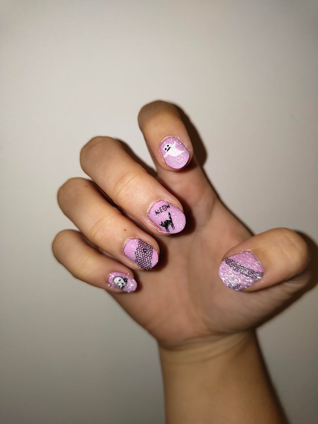 I haven't done nails in a while, halloween gave me the push to make something new. Polishes used: Rival colour softies 05 lavender life, Holo taco reflective taco. Stickers from AliExpress by I_love_Projectiles