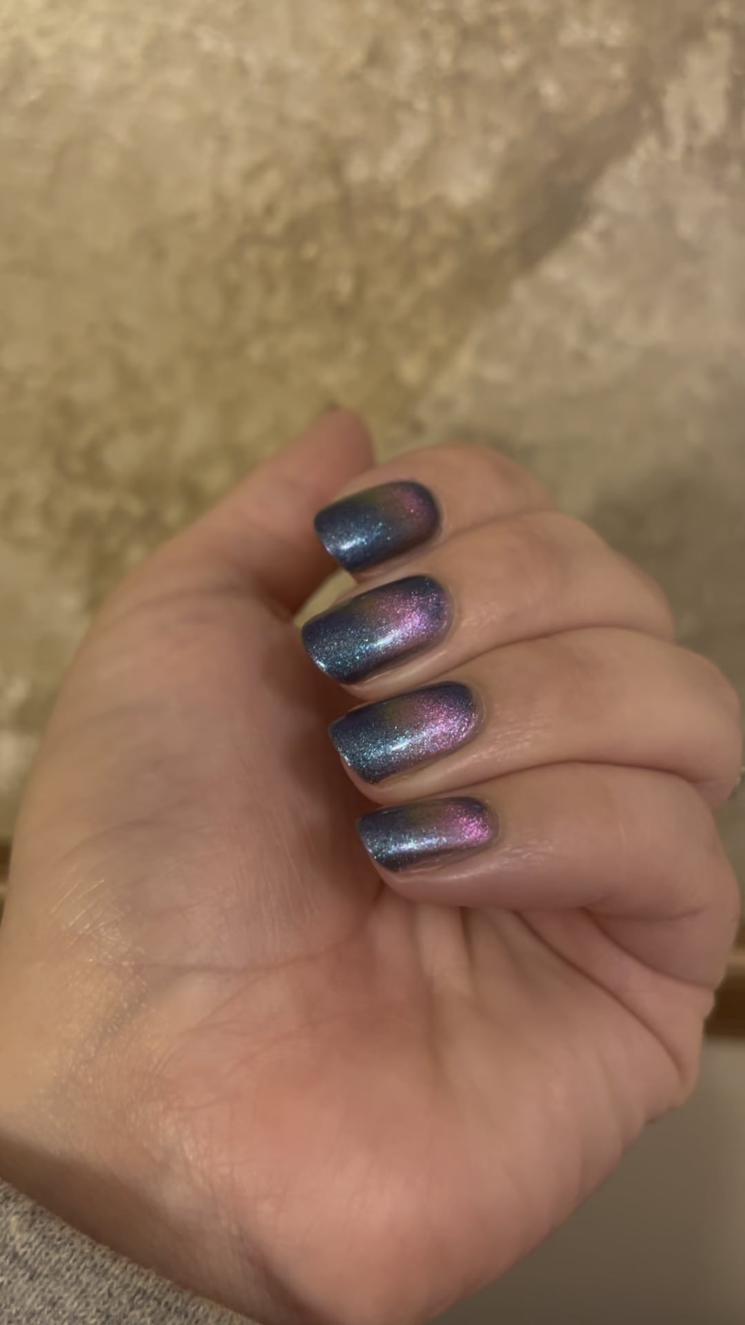 in most lighting the base flips from teal to cobalt and the magnetic shimmer from fuchsia to gold, but at extreme angles i get pops of deep green in the base and lime green in the magnetic!