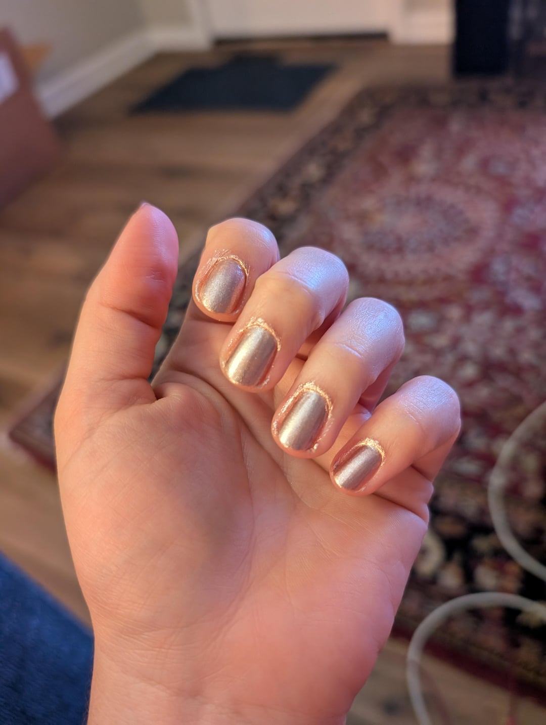 I made a [swatch post](https://www.reddit.com/r/RedditLaqueristas/s/qEb69oPohl) of a similar color from *pop•arazzi* (a cvs brand), it’s called *Shine Baby Shine*. In the post the color is on my left pinky and in the post I have more photos of that specific bottle. I also have a link in the post to my YouTube video with a better showing of the color. 3:17 is when the swatch is shown in the video.