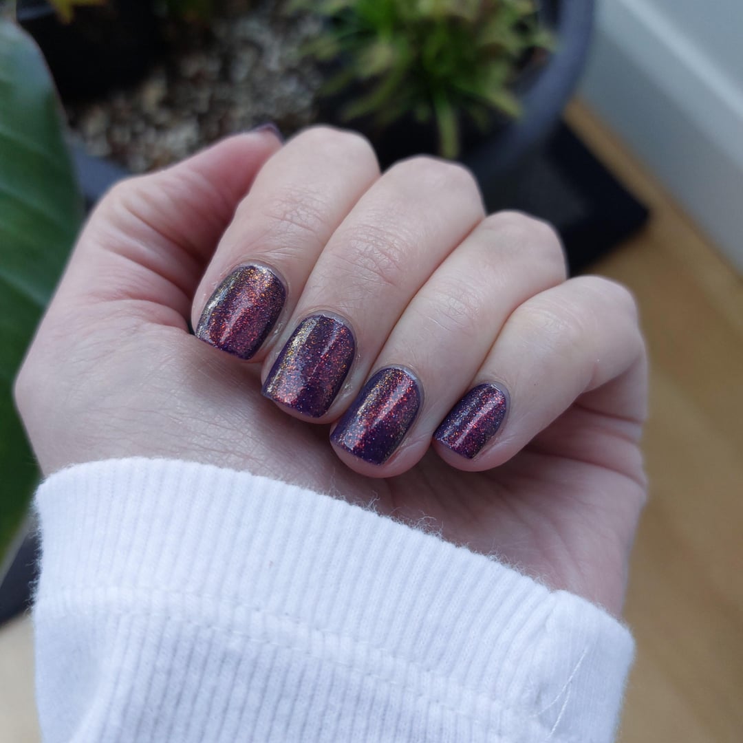 Holo Taco fan, so I used one coat of Nightshade as the base, one of Tanzanite Away for glitter, then one of Scorched Earth to shift it from a blue-toned purple to something warmer.