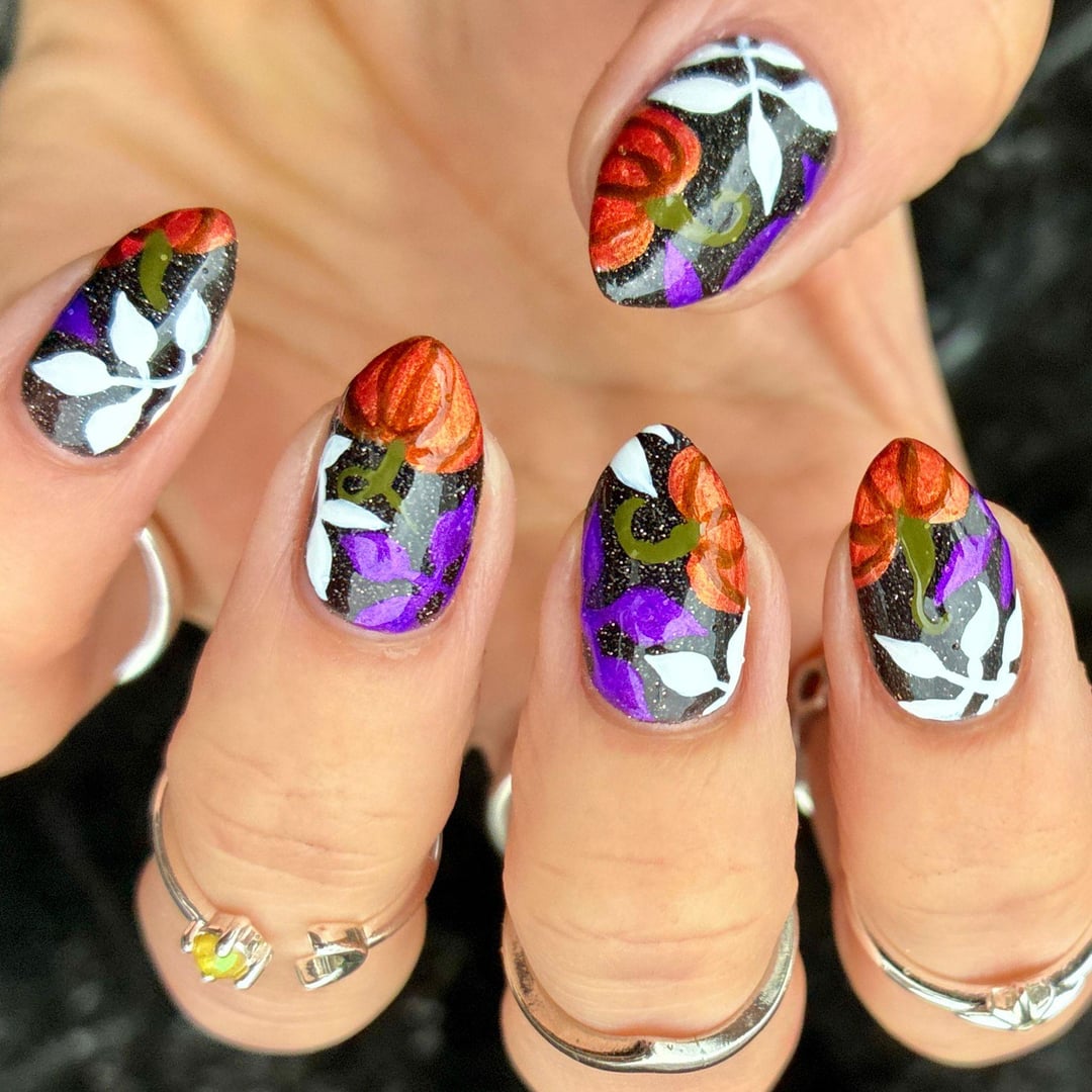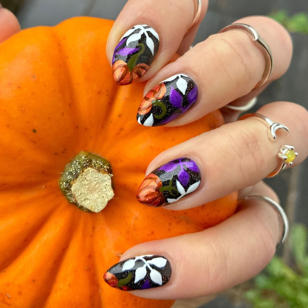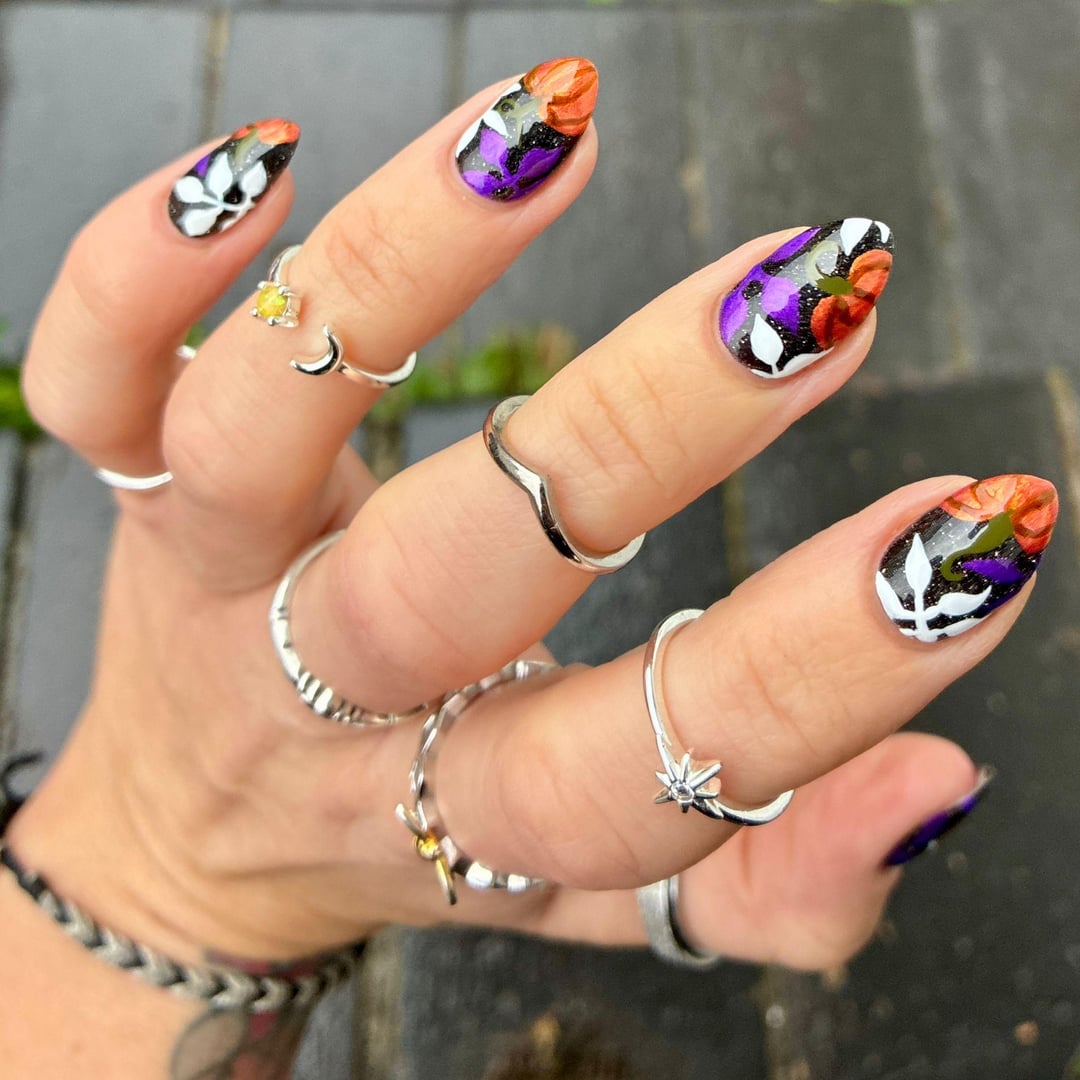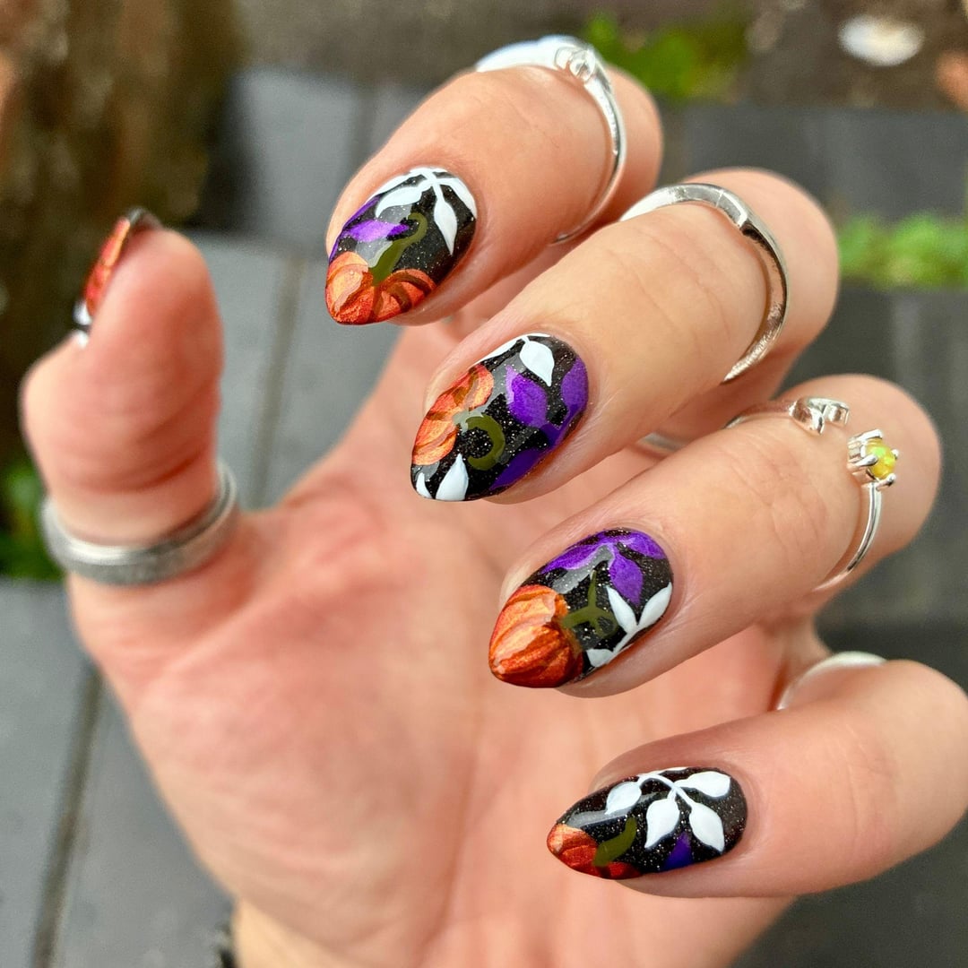 lookatmynailsdamnit on October 25, 2025 12:07 pm Hand-painted with regular polish. I had a lot of fun doing this one and I’m super happy with the results. The polishes are by Radioactive Unicorn, Prism Polish UK, Mooncat, and Orly. Insta: lookatmynailsdamnit
