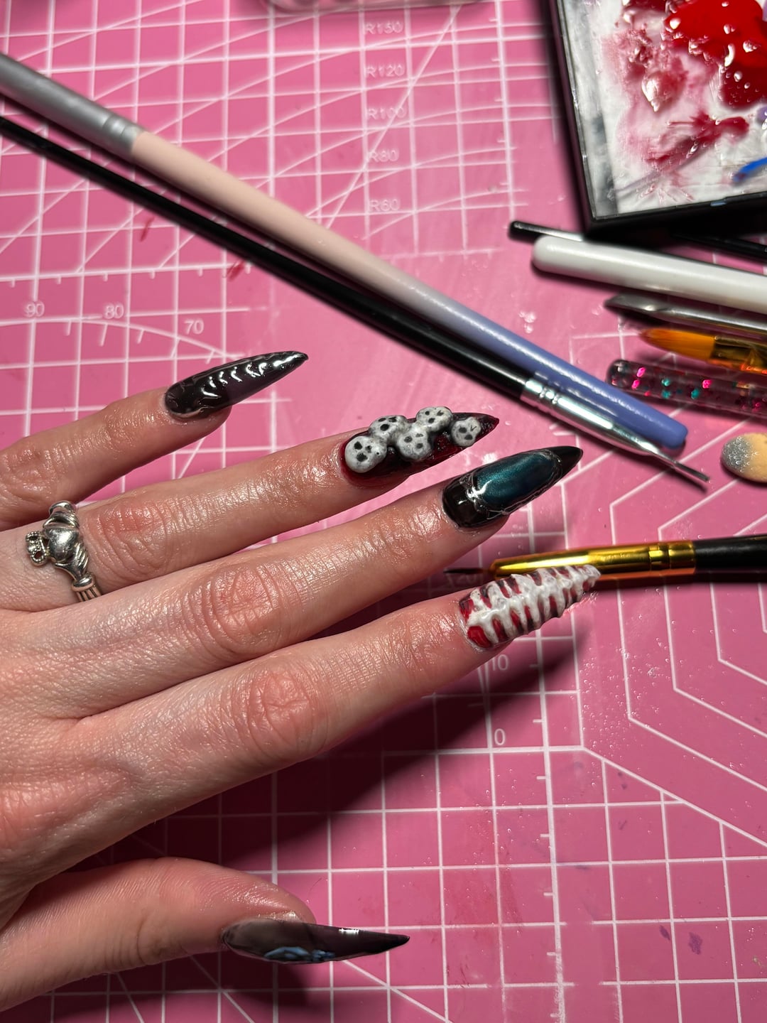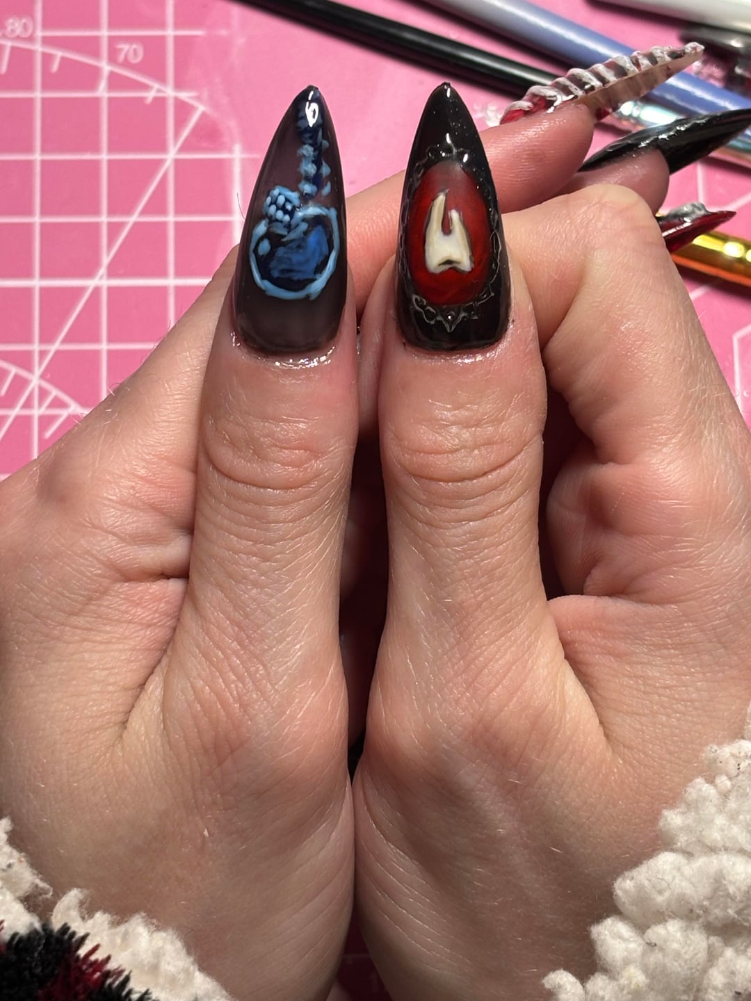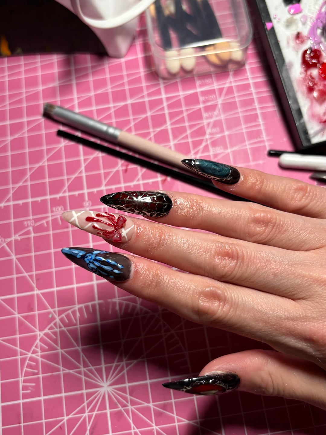 Also some pics of my recent set cause I’m proud of them 🥲. You can see the thumbs don’t really fit but that’s the largest tip size in the box.