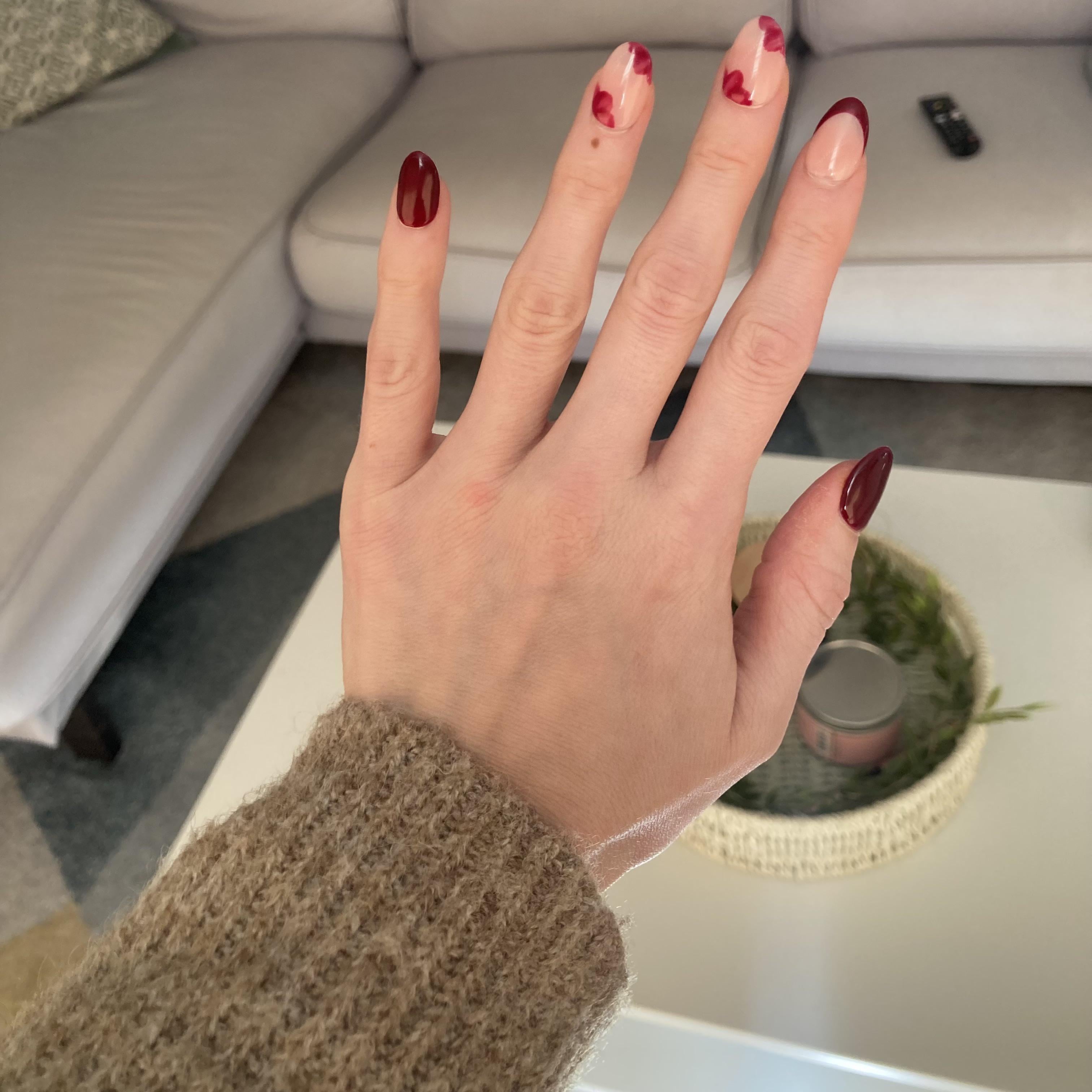 They look just a smidge too big, especially pinky. It just looks too wide for your nail (and sometimes you’re stuck between sizes and have to do the best you can) but I’d go 1-2 sides down on each nail. You can tell because you can’t see enough of the skin on the sides of your nail.