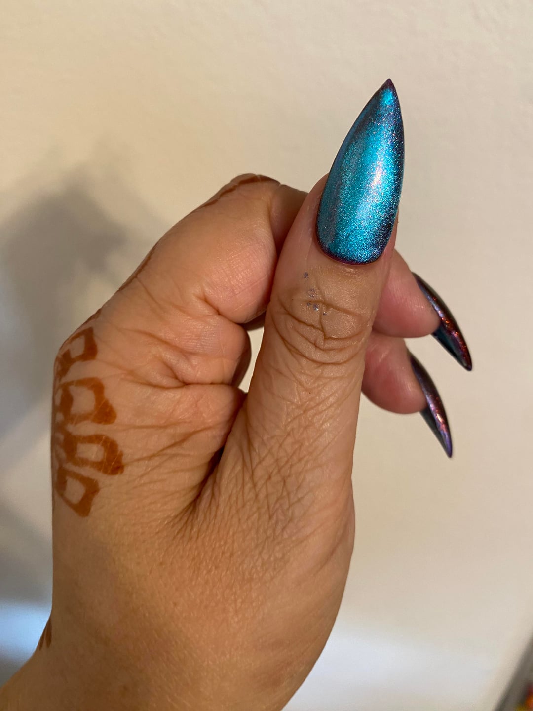 Shown here with 3 coats on allisa almond nail tips filed and topped with tenacious glaze.