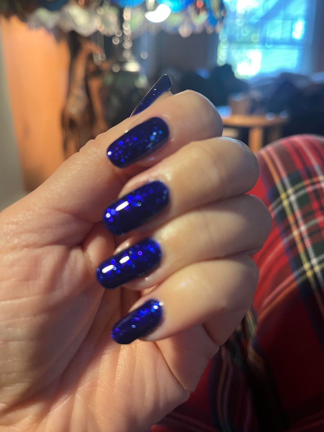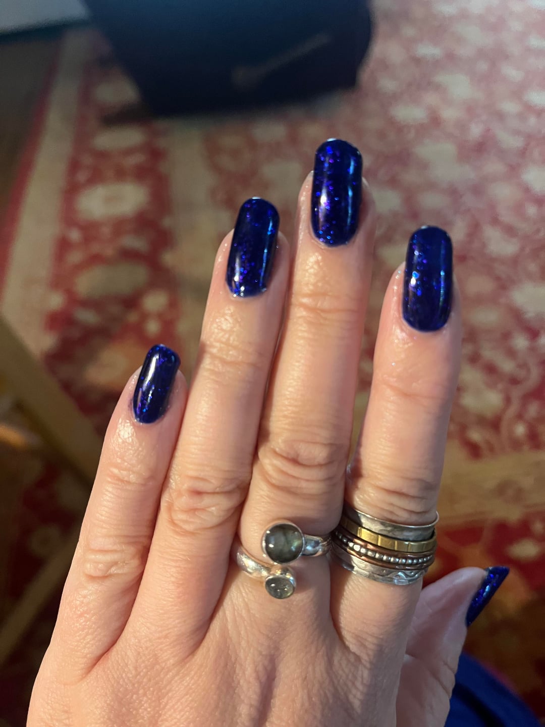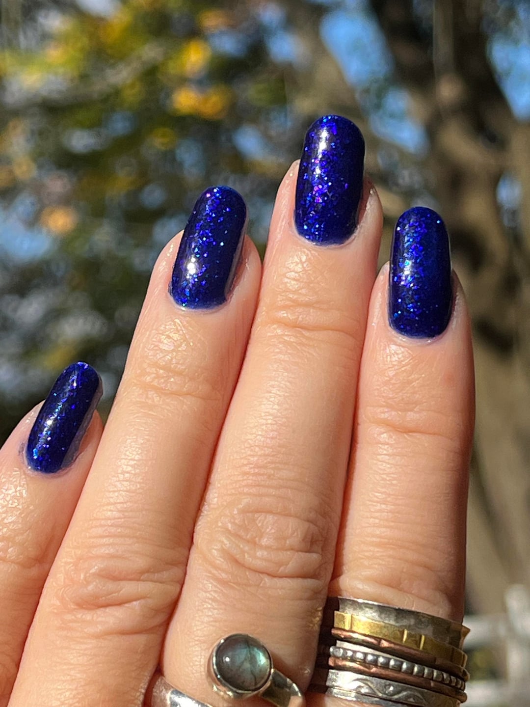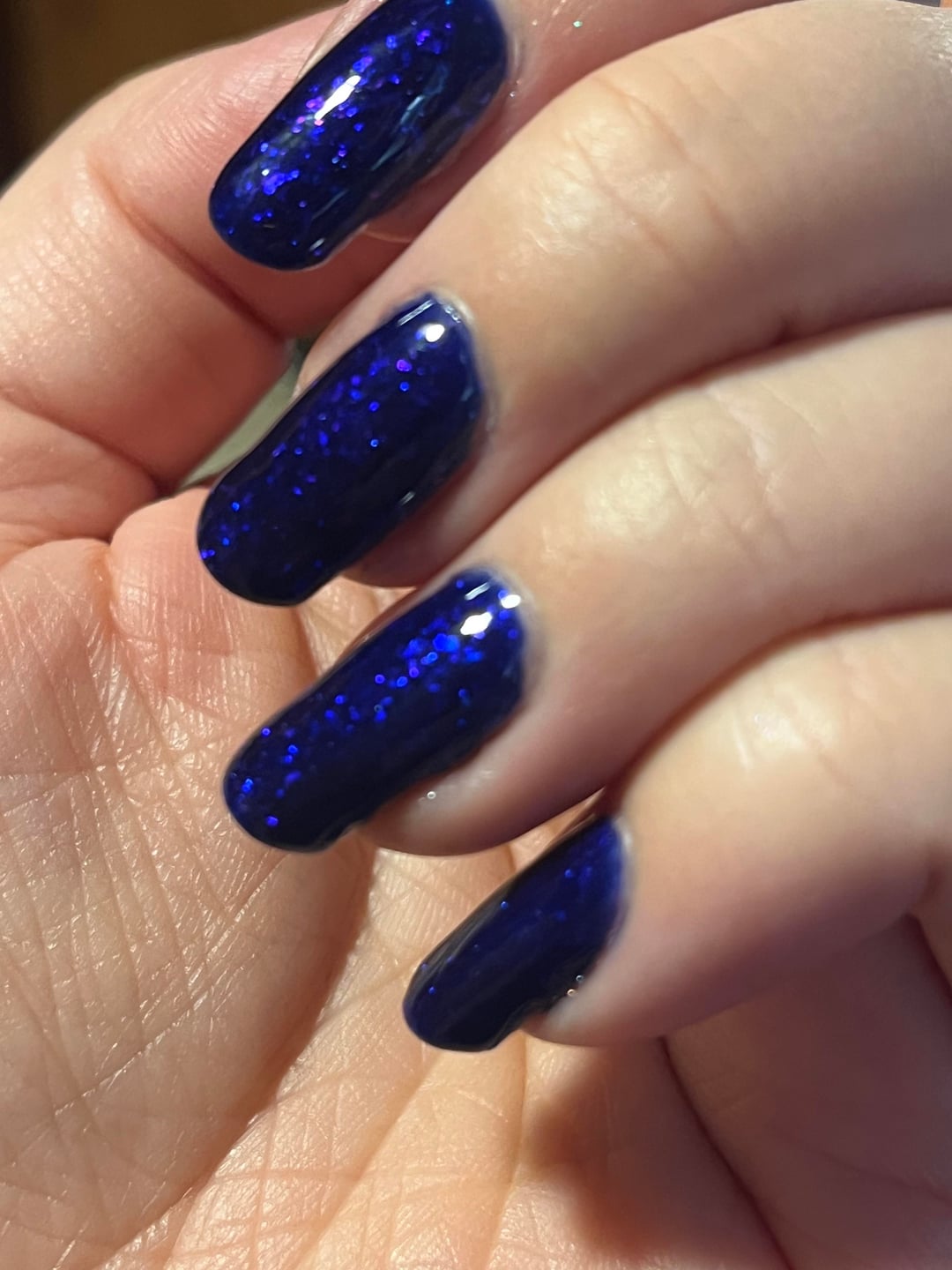 Base coat nailtiques 2; 2 coats Lurid Lacquer, “As the long dark night gives way to morning.” Kb shimmer smooth moves glitter grabber; Mooncat speed demon quick dry top coat.