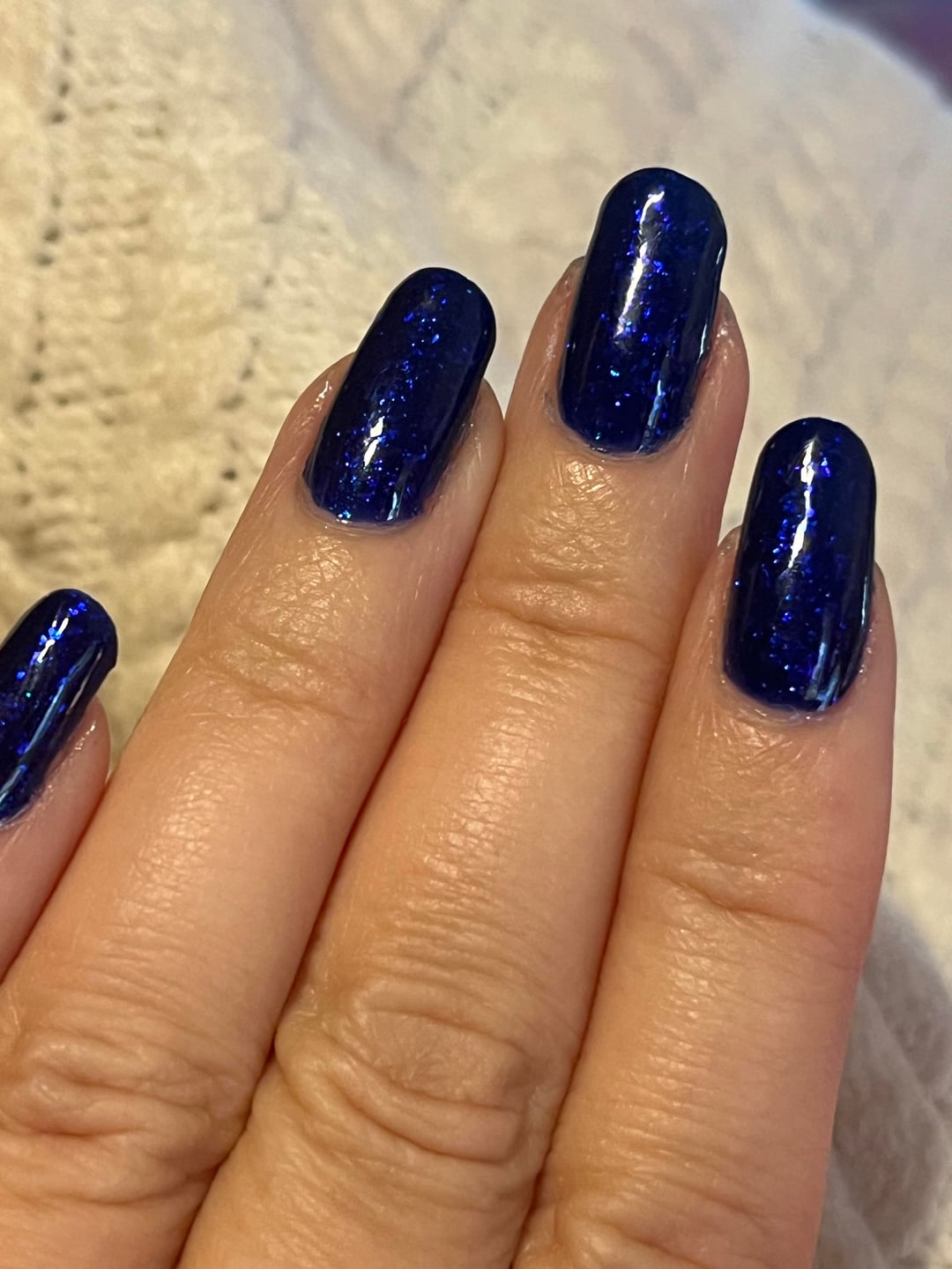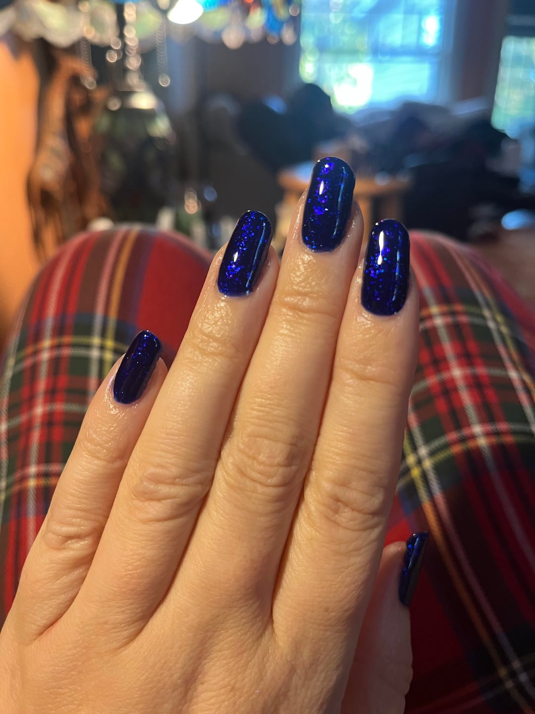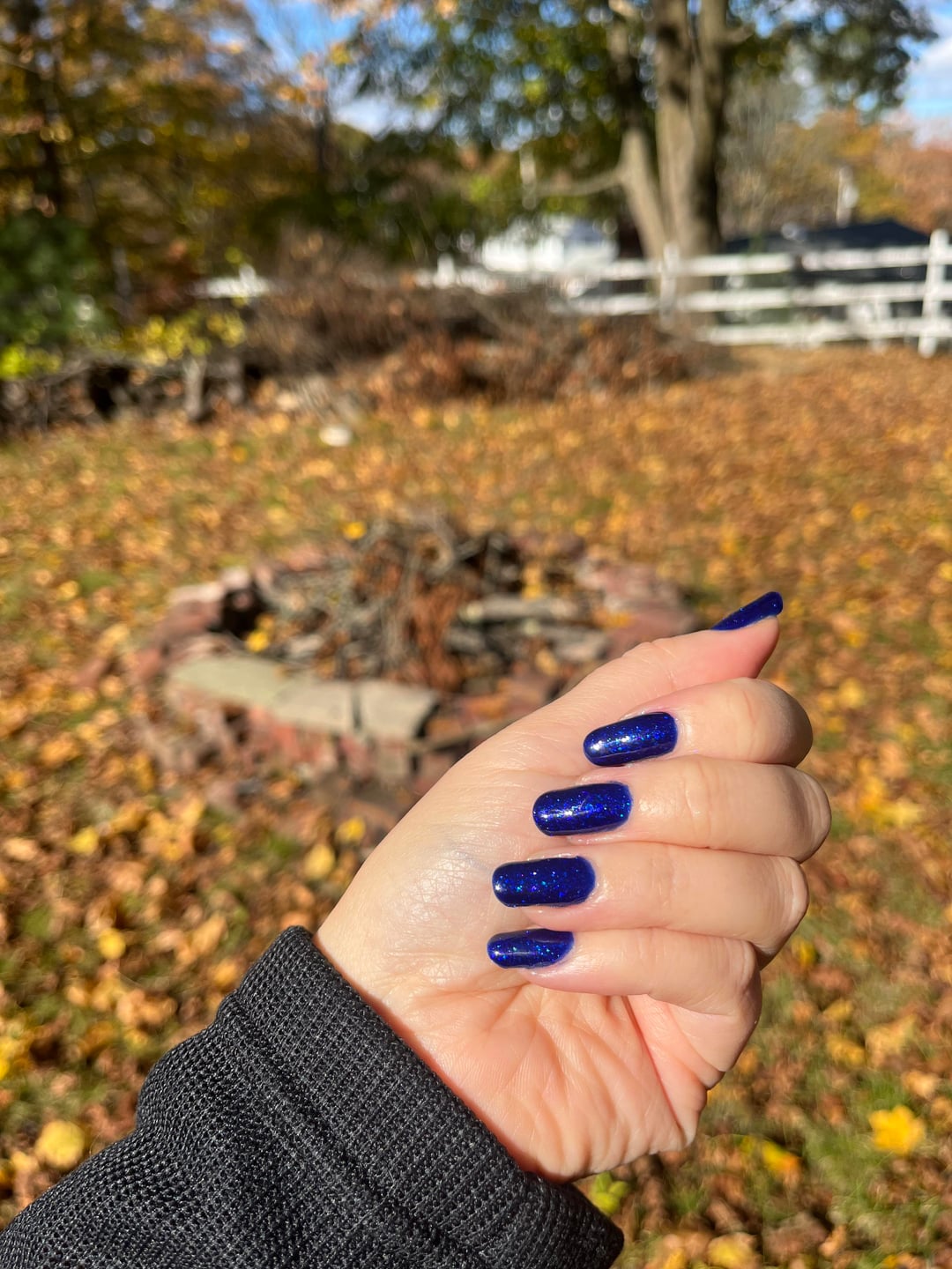 Base coat nailtiques 2; 2 coats Lurid Lacquer, “As the long dark night gives way to morning.” Kb shimmer smooth moves glitter grabber; Mooncat speed demon quick dry top coat.