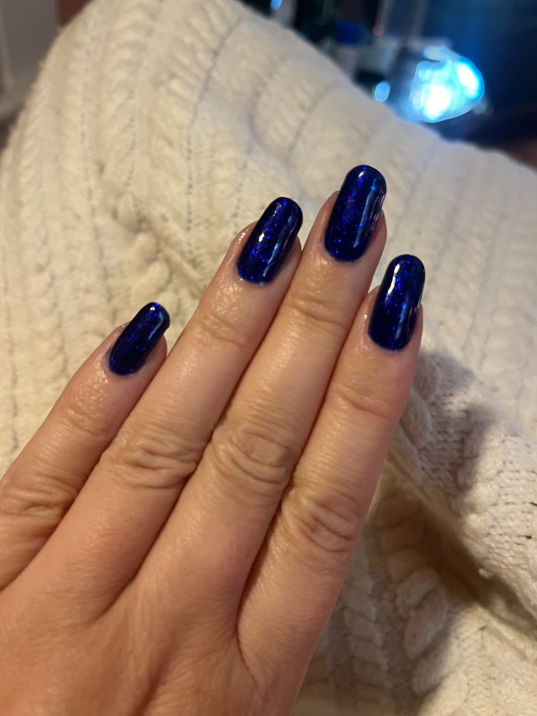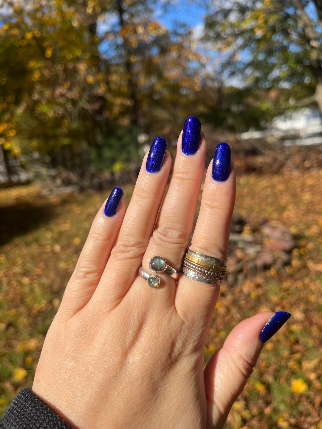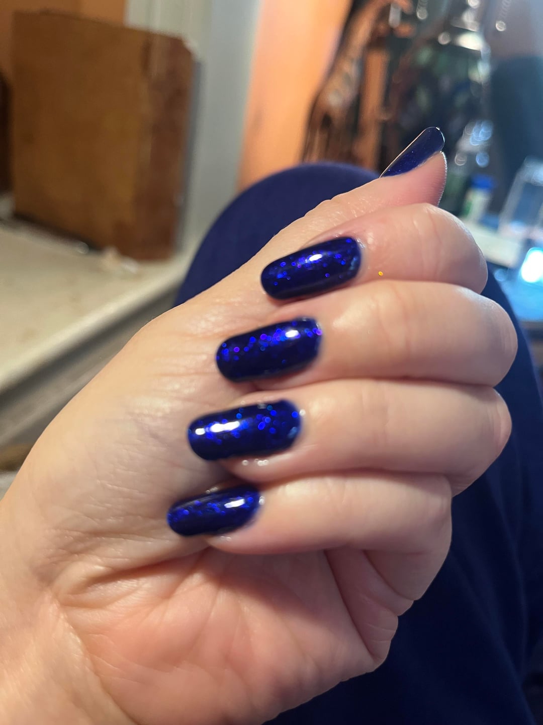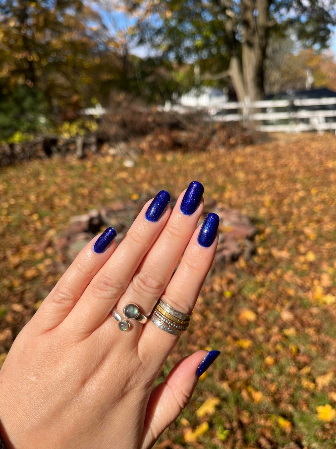 Base coat nailtiques 2; 2 coats Lurid Lacquer, “As the long dark night gives way to morning.” Kb shimmer smooth moves glitter grabber; Mooncat speed demon quick dry top coat.