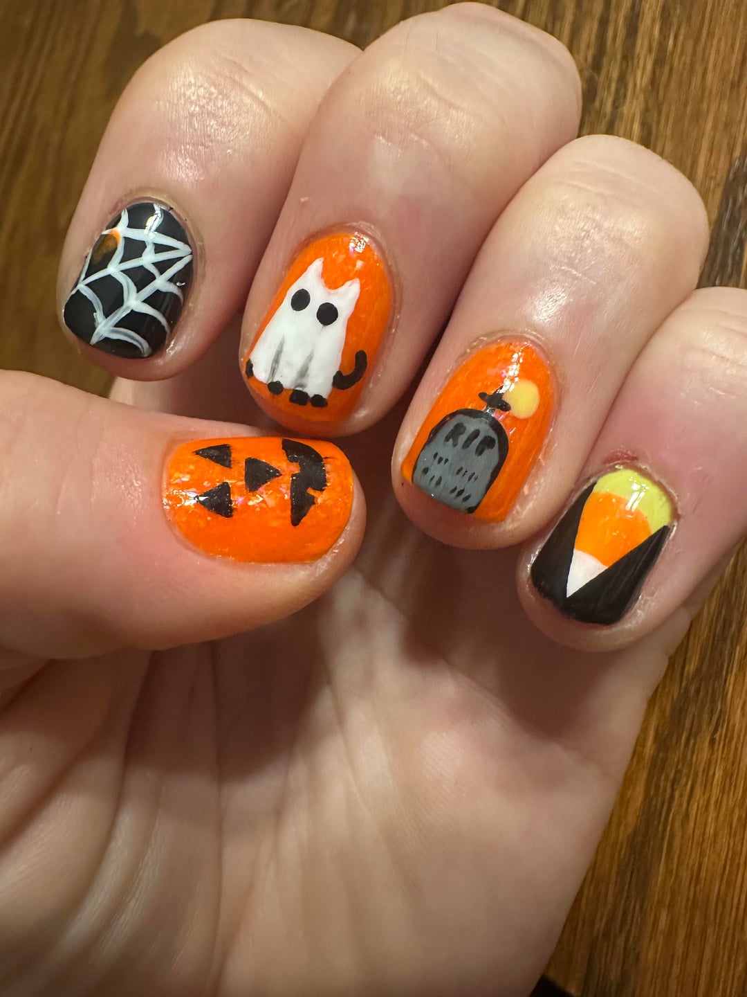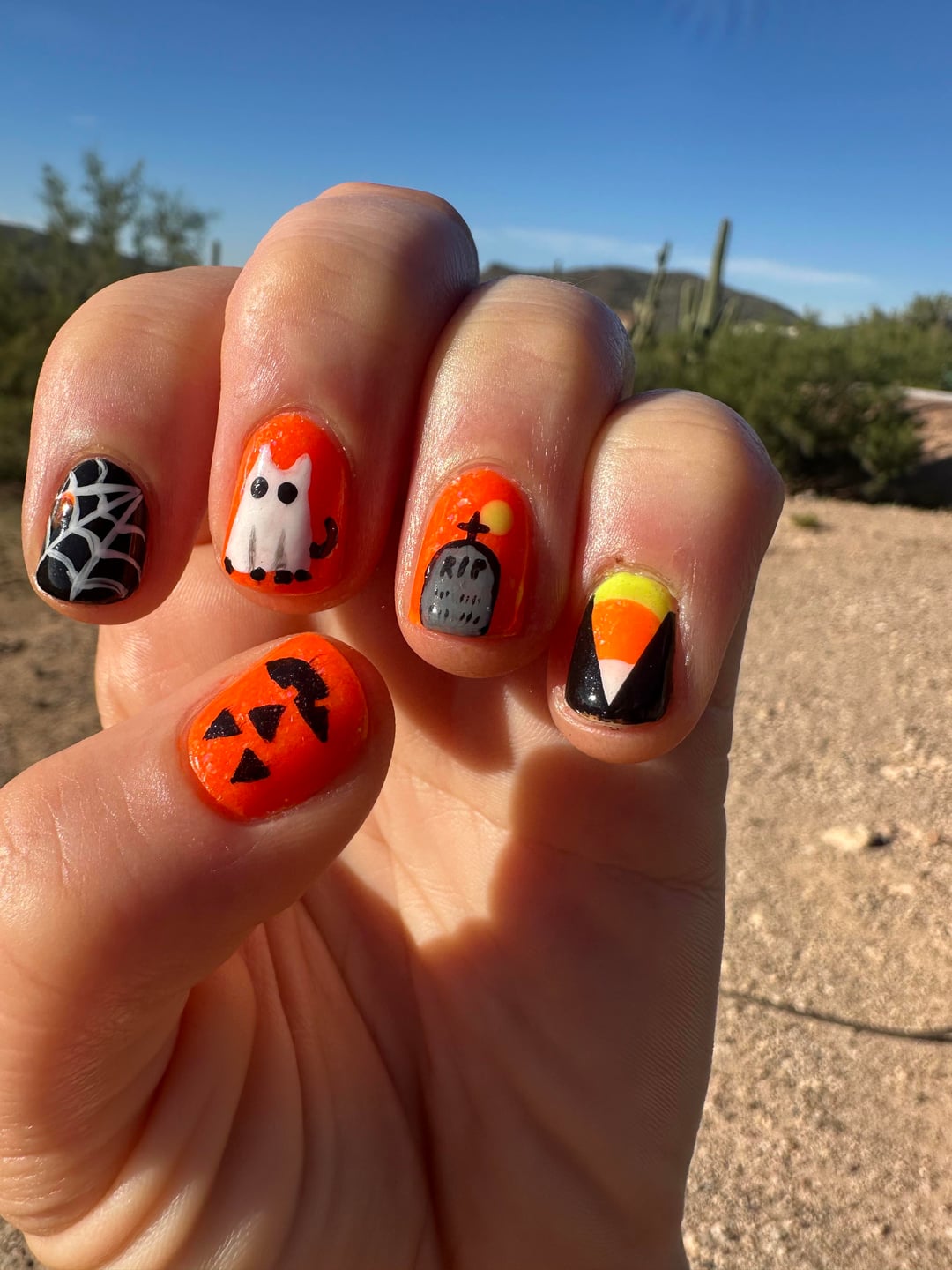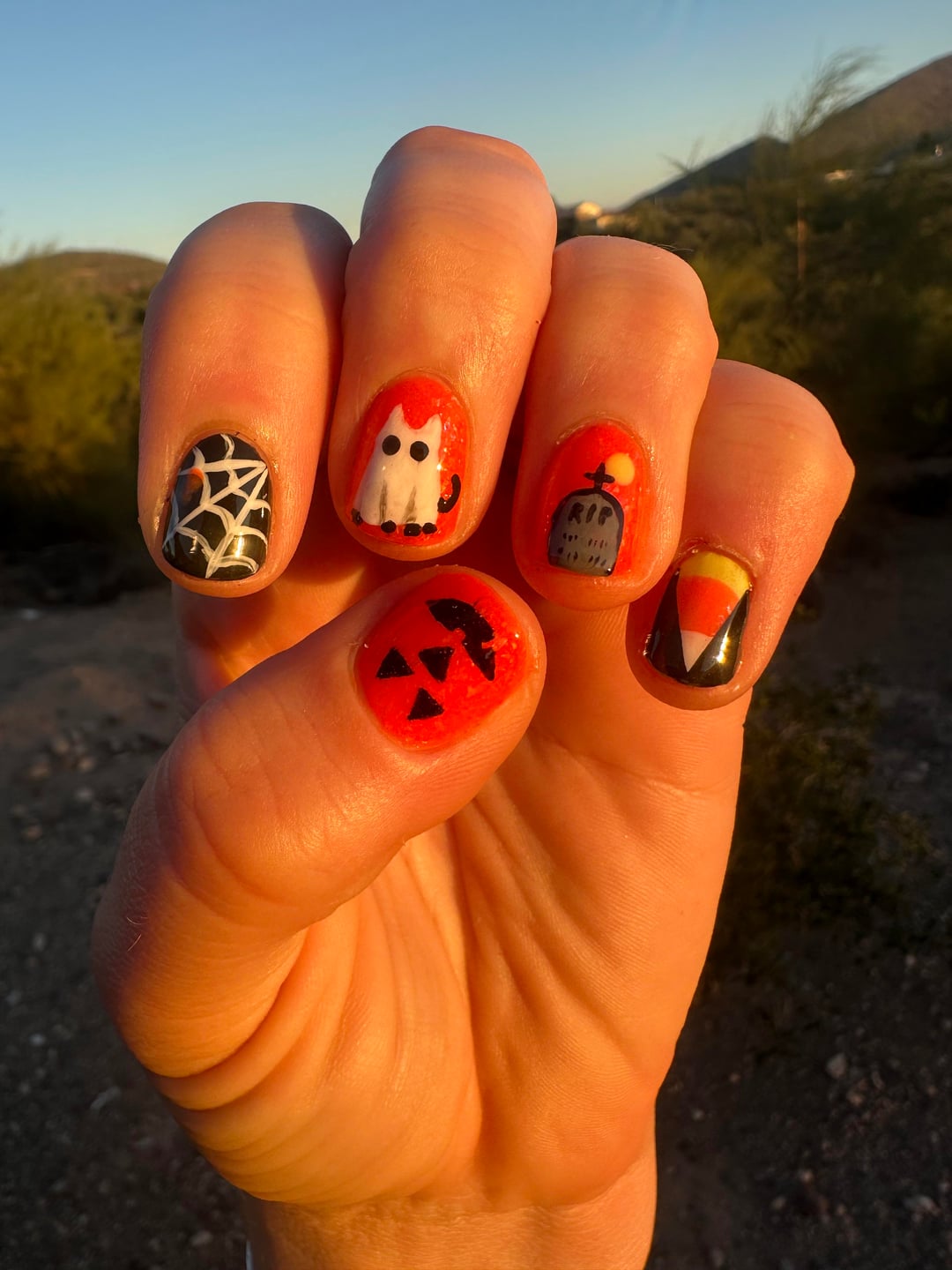 All polishes used: Base: Nail Tek Foundation 3. Top: ORLY Sec n Dry, Essie Gel Setter Colors: Doom Loop: Pyroplasma, Leminominon, Voidling. LA Colors: Energy Source. ORLY: into the deep by GrappleLacquer