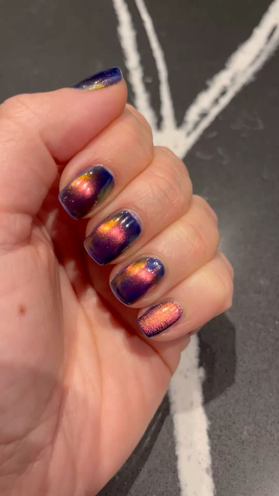 This is what I called "chaos velvet", because the effect is almost like velvet, but with more colors at the same time, and they move and change when I move my nails. Pinky is a regular velvet, but it somehow does not shift colors the same way, not sure why. It never shoes the green hues.