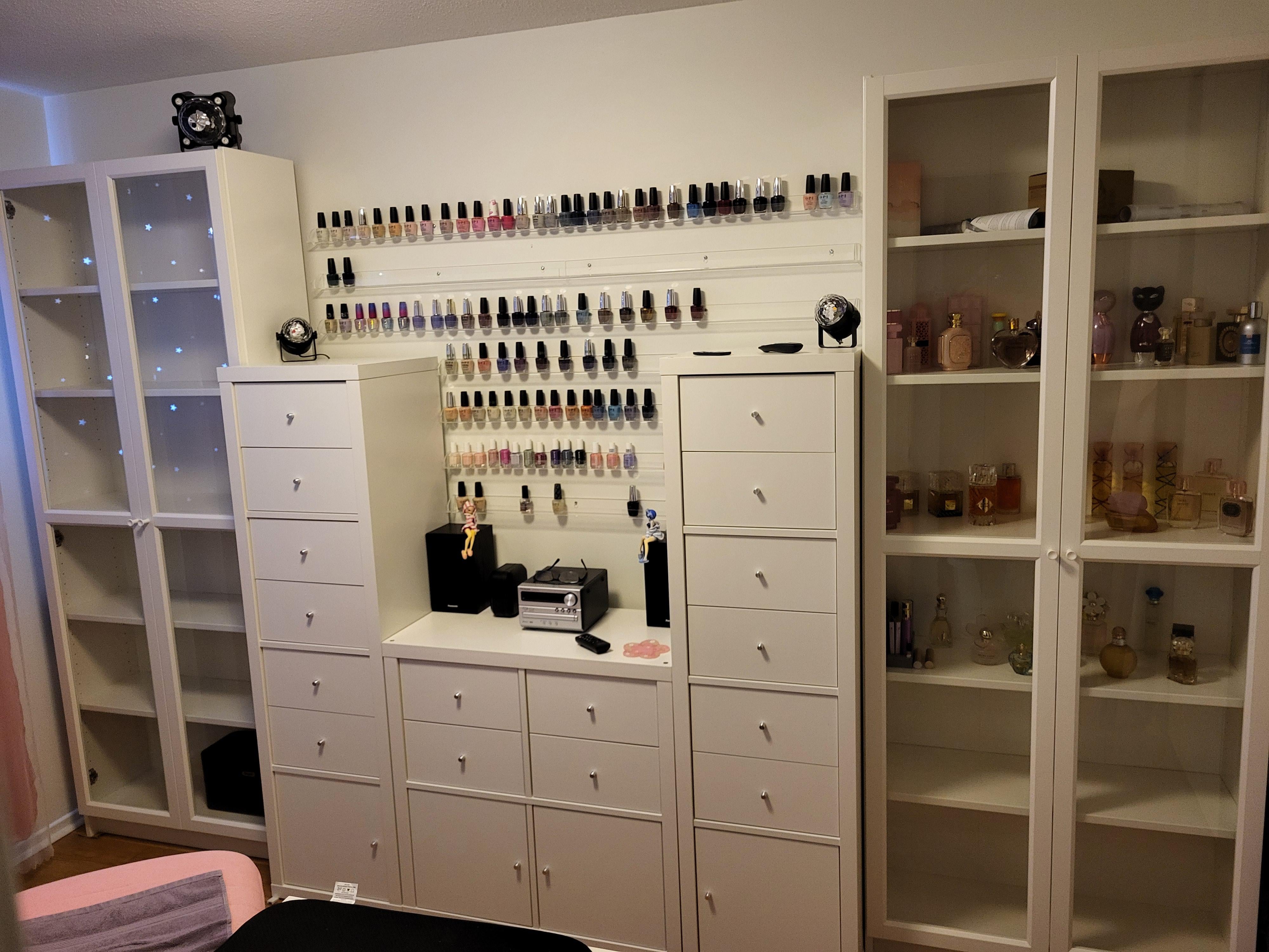 Finally moved into my own place so put together this storage wall for nail polish perfume and other stuff most of the drawers are still empty I'm trying to make it so that I don't run out of room in the future so easily. I had six racks that were full I added four new ones and I have two in reserve in case I fill those up. It's still a work in progress as always.