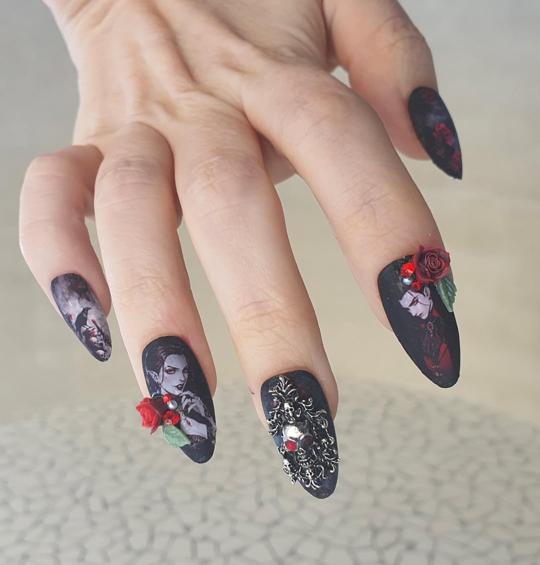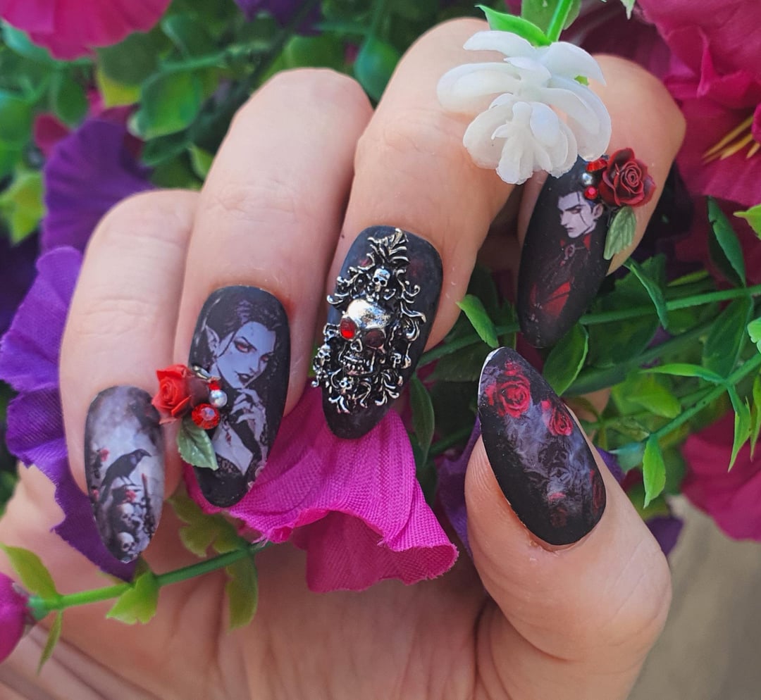 For this set, I used homemade decals, 3d metal charm and red roses, rhinestones and pearls Matte top coat to showcase the details by Key_Opportunity_7082