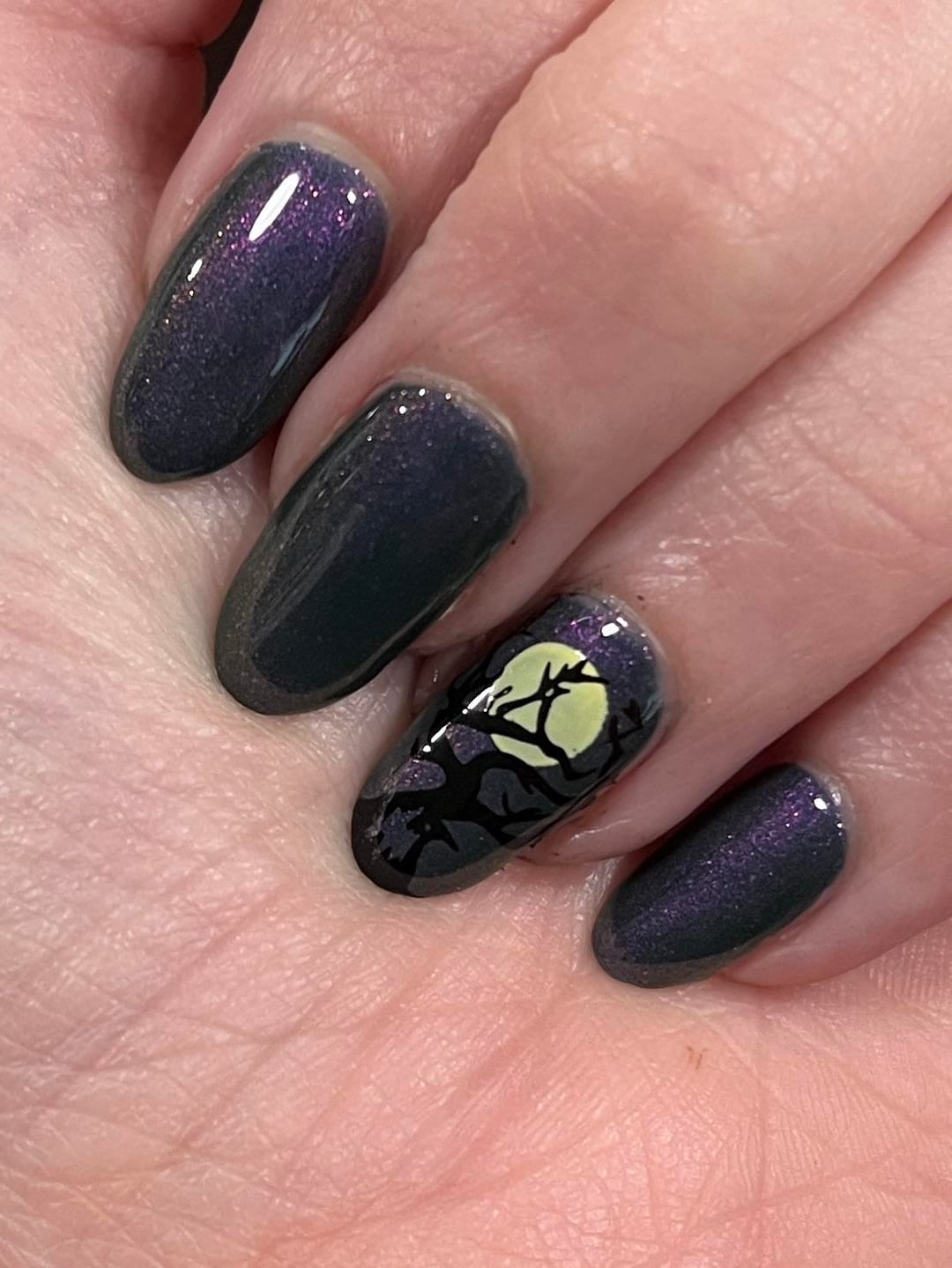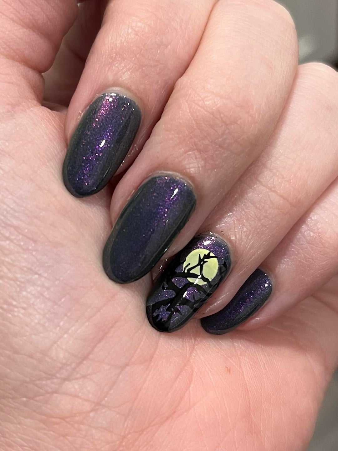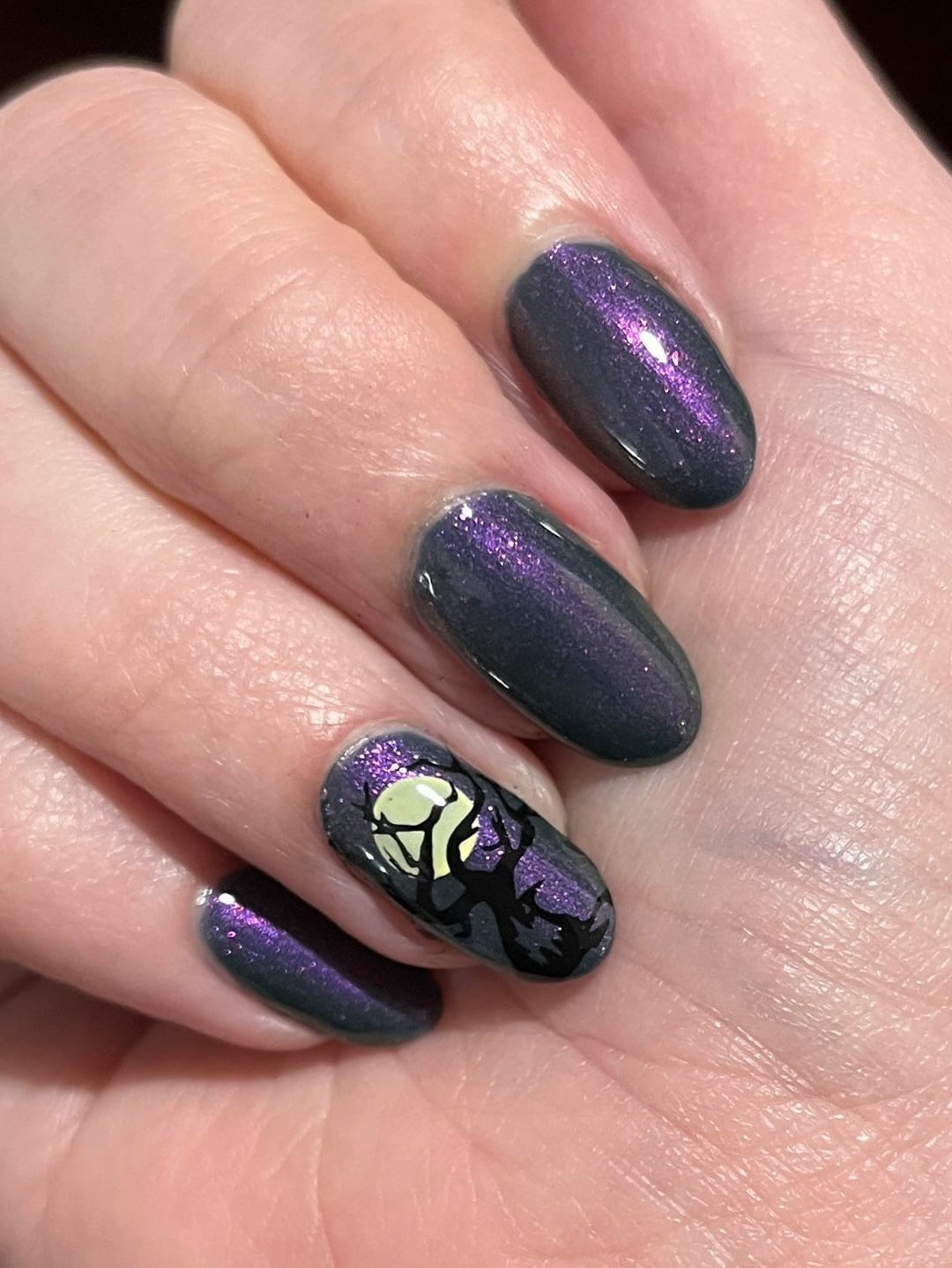 Impossible to photograph accurately, this new polish by Daisy Chain is stunning! I thought it would make a great Halloween night sky. 🙂