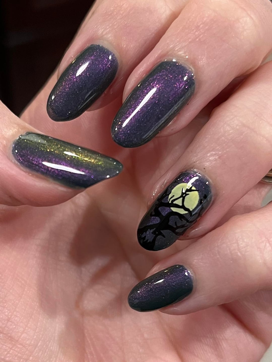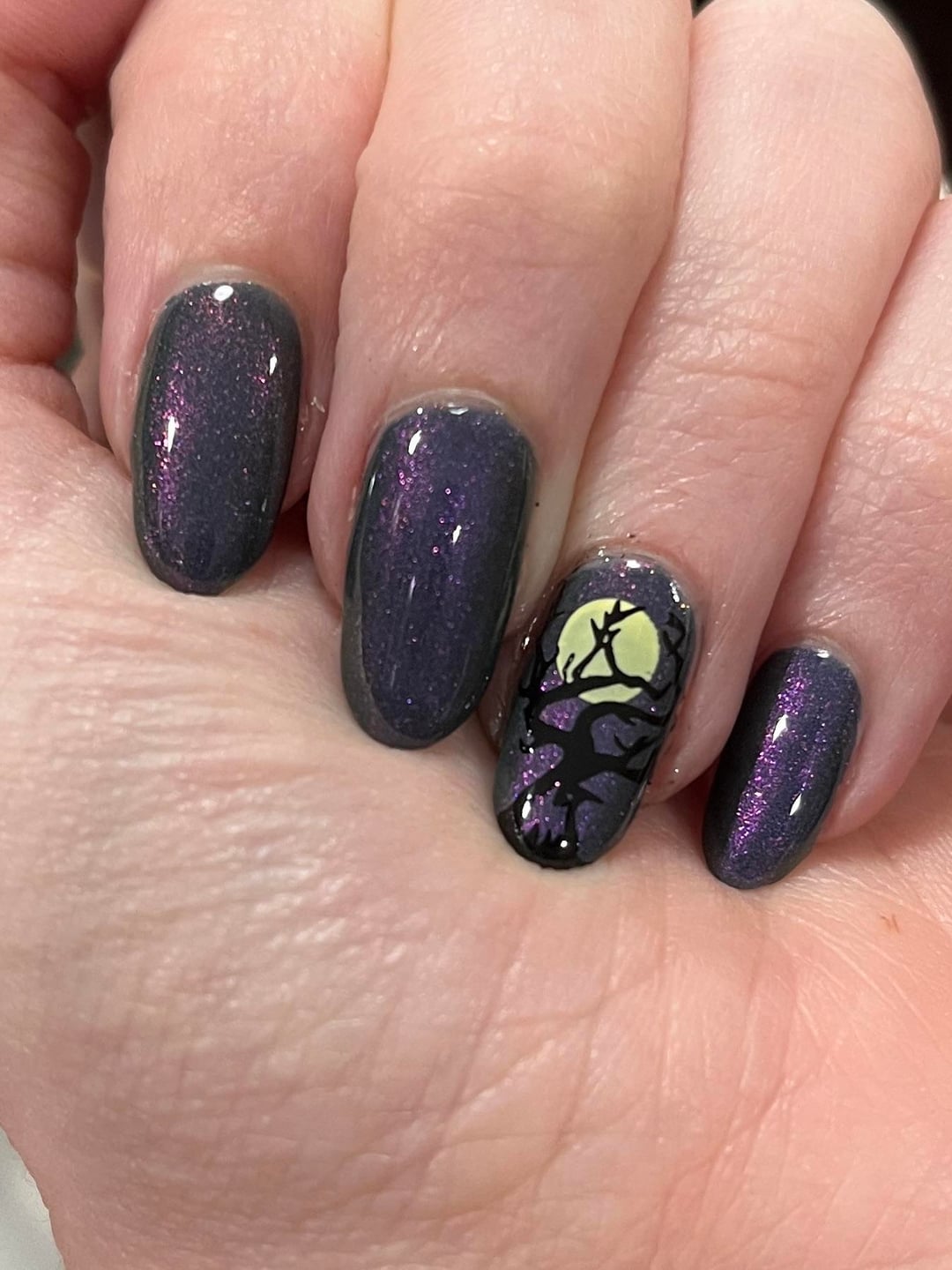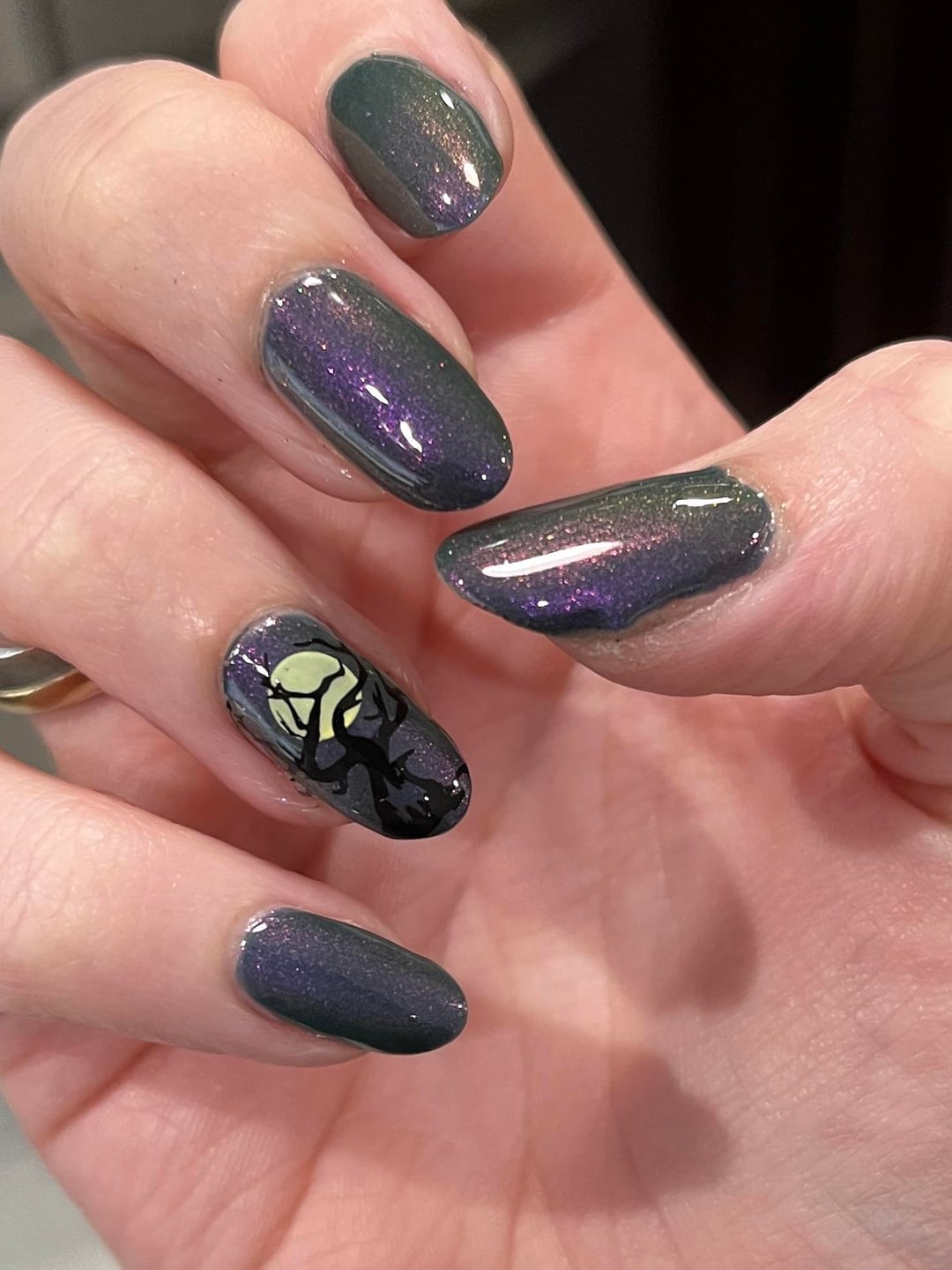 Impossible to photograph accurately, this new polish by Daisy Chain is stunning! I thought it would make a great Halloween night sky. 🙂
