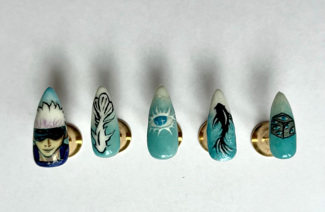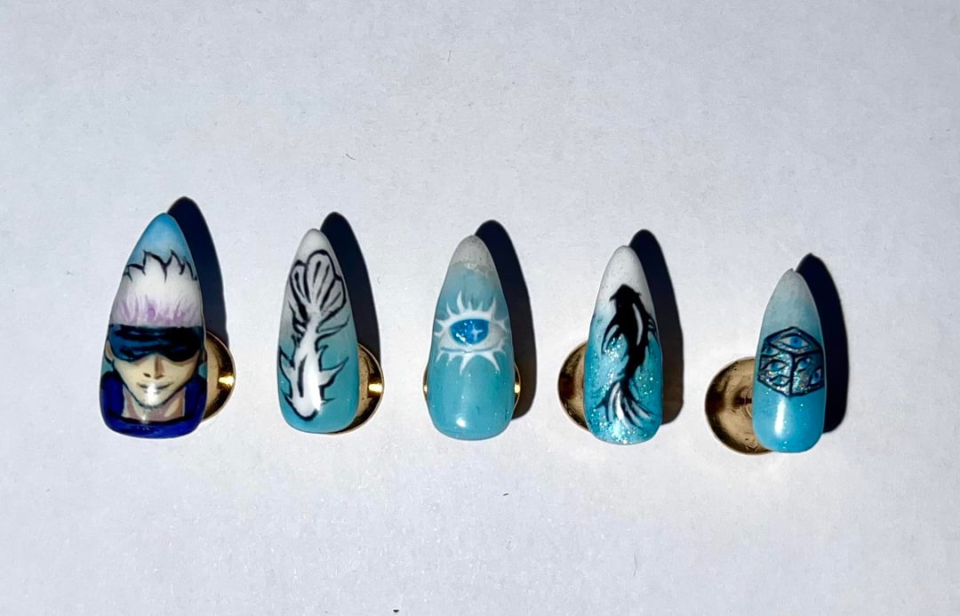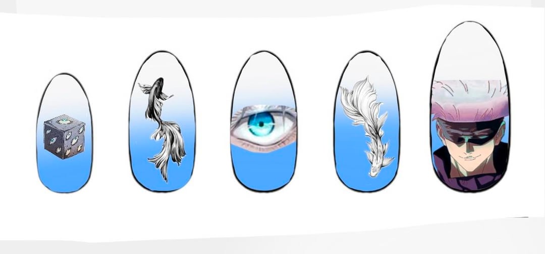 Tried my best to take a good picture lol. My first trial for my Gojo set, might redo it later but I’m so proof how it turned out ! See inspo on last pic by PrincessePudette