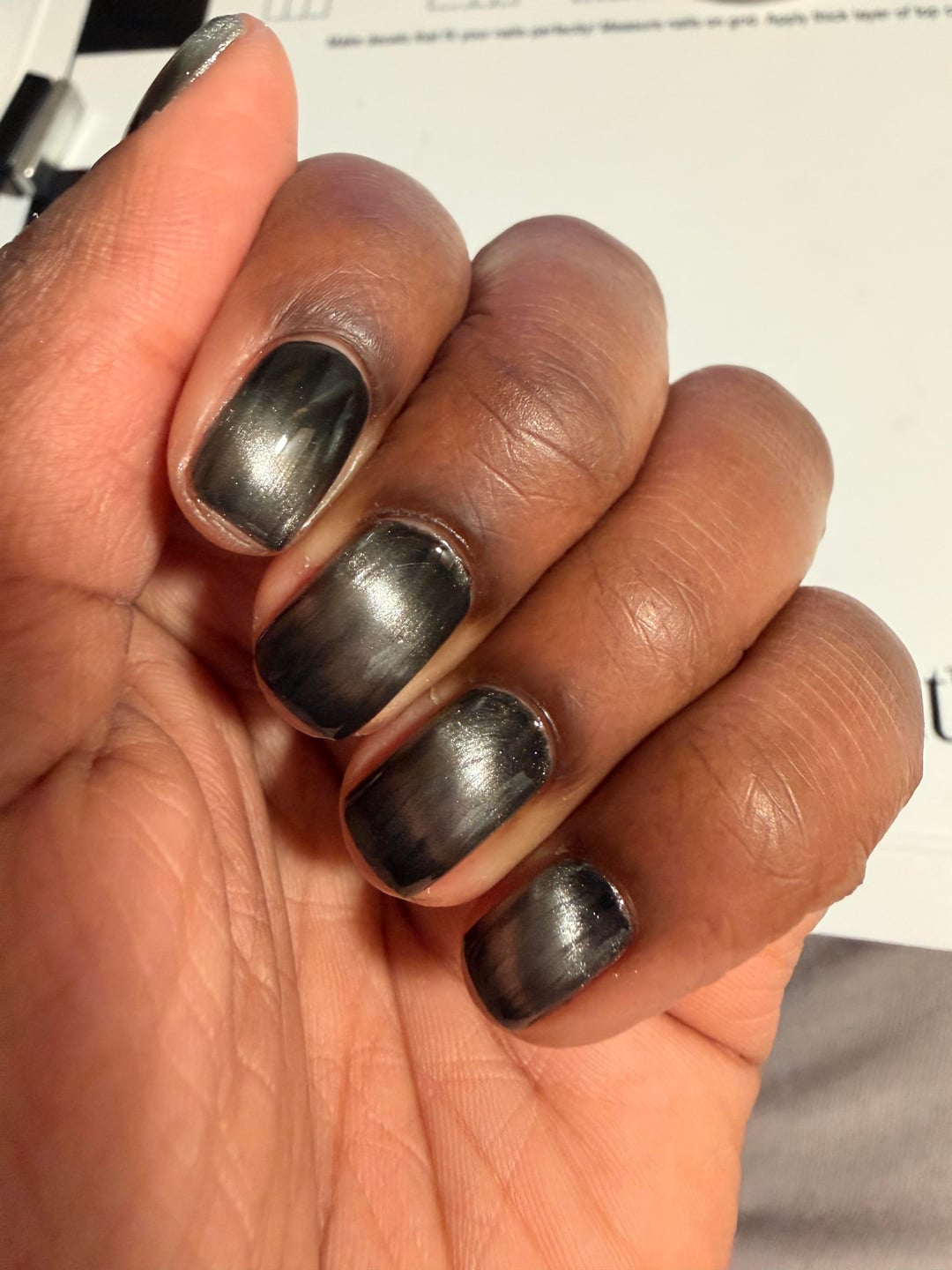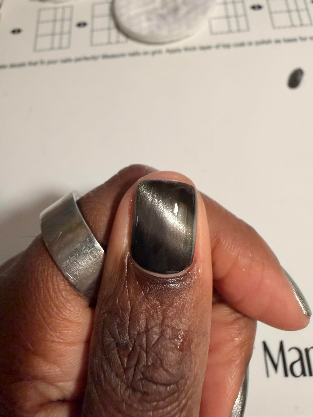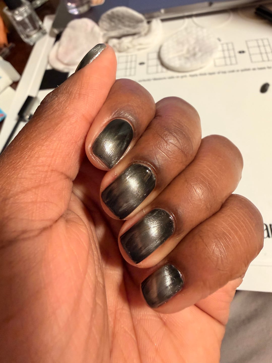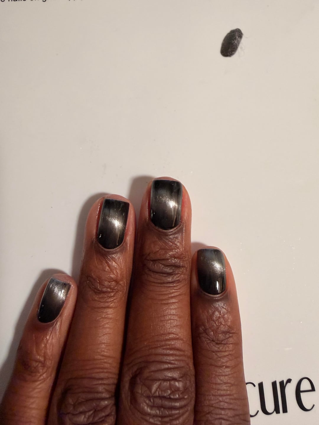 This is the last polish I bought from Mooncat’s Danes Macarbe collection and when I tell you, i went through hell with this polish to get this result. I first tried this polish two weeks ago and struggled so much trying to achieve the magnetic effect i wanted. i wanted to velvet some nails, use the rectangular bar for others and also kinda reverse magnetize it where you would see just the black part of the polish. I redid my nails twice before giving up and switching to a different polish.