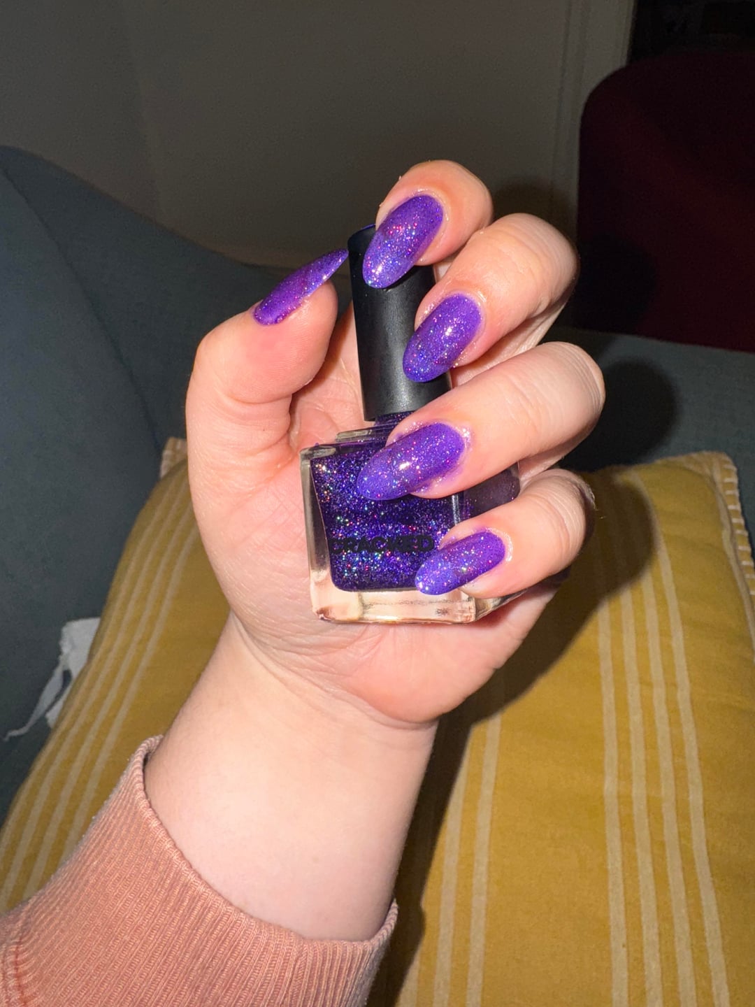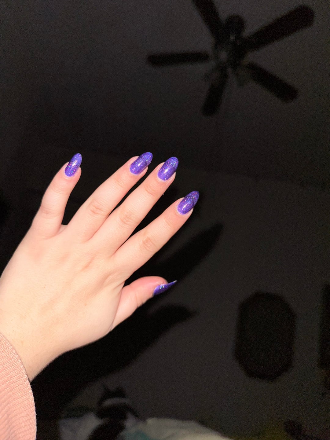 Base color is a blurple, and the holo glitter is denser than I expected. Can't stop looking at them lol.