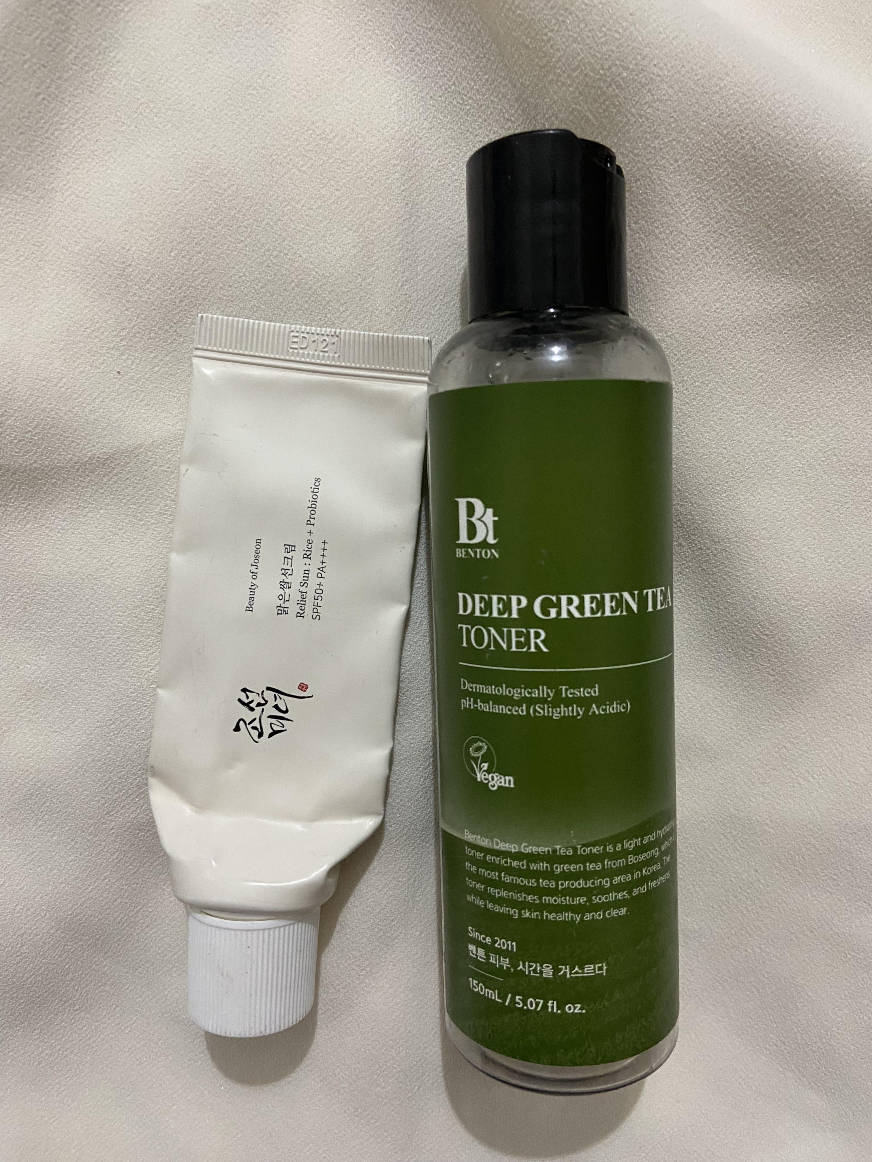 Product List: BOJ Relief sun: Rice + probiotics spf 50+ PA++++ Easy to blend, no whitecast and left my skin feeling moisturised and glowy. Benton Deep Green tea toner: Light and watery toner, great for the summer. by Rich_Awareness2359