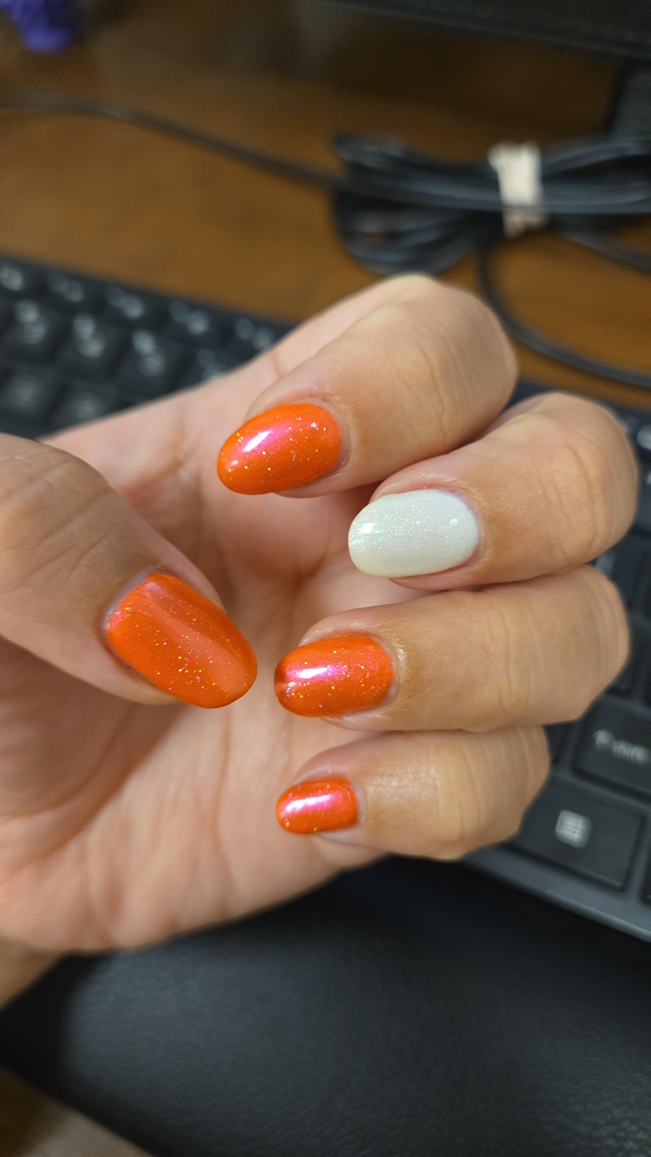 Rubber gel base-Bar Babe Poems for a harvest moon -MC Moondust topper-MC Green eyed monster – MC Gel Settler Top Coat – Essie Like she's the only one who naturally is that shape every other finger is a square ⬛! by mightygabbs