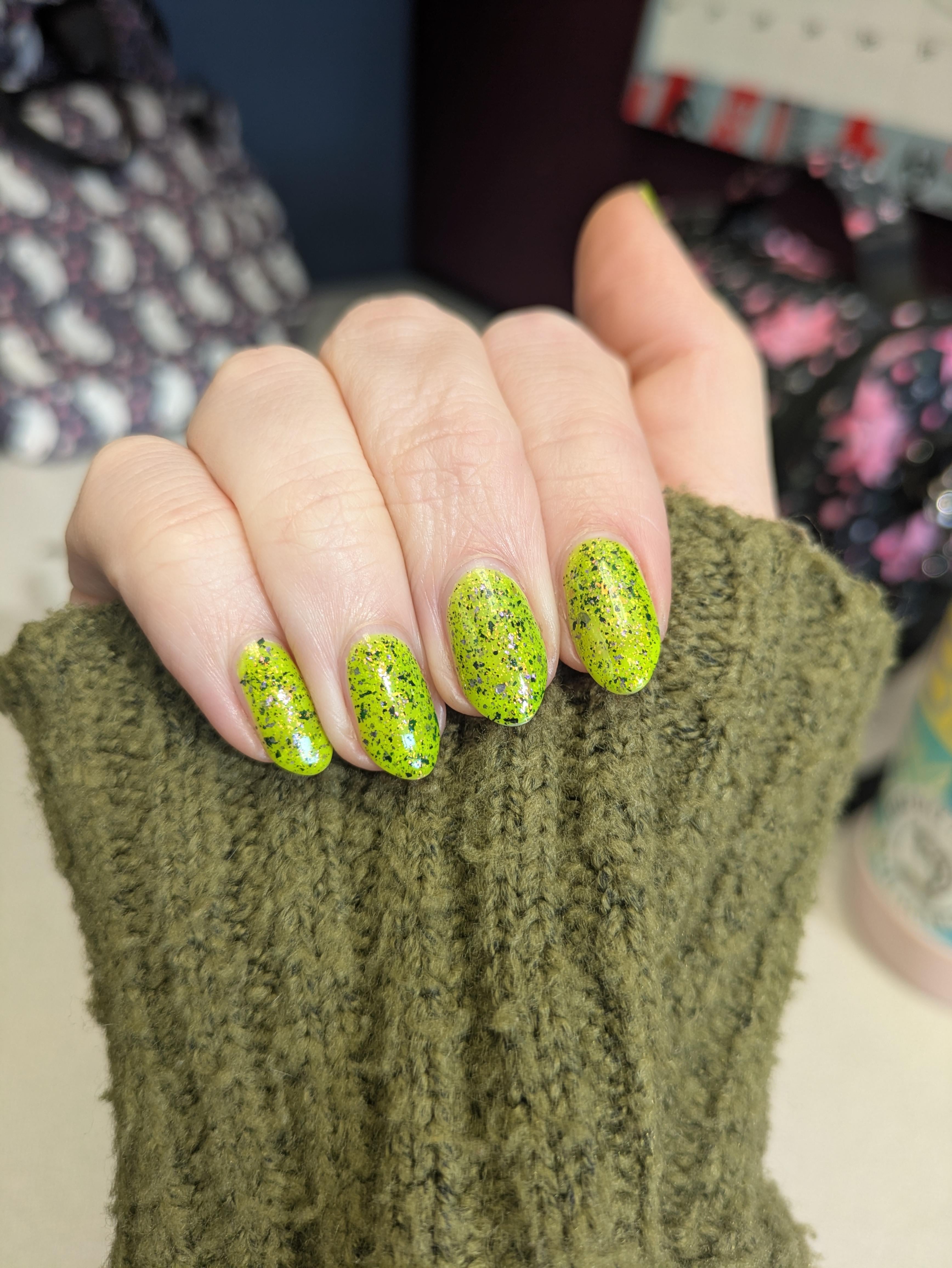 This one was calling to me for Halloween this week! It’s glow in the dark and the slime green color is perfect with the flakes. Bonus points for being a favorite horror classic of mine. I’m definitely interested in trying more from this brand, the formula is super smooth and built up beautifully in 2 coats!