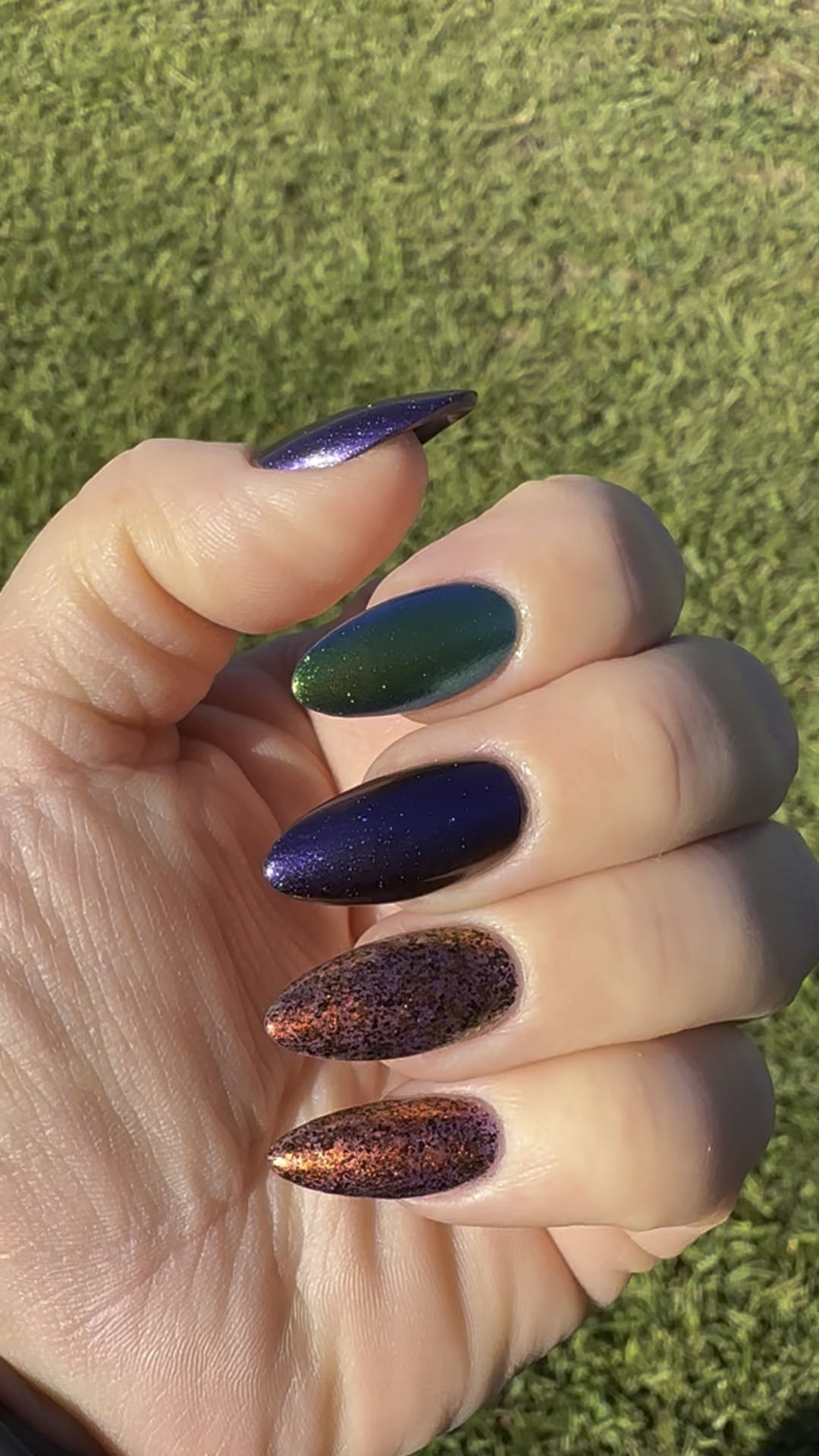Love how well these colors go together! It’s giving Hocus Pocus vibes! Thumb & middle (mooncat mortals be warned), pointer (serpents of eden), ring & pinky (cuticula, sugar slasher – September ppu) by Playful_Main_8530