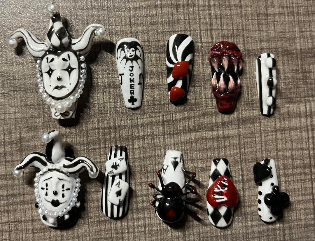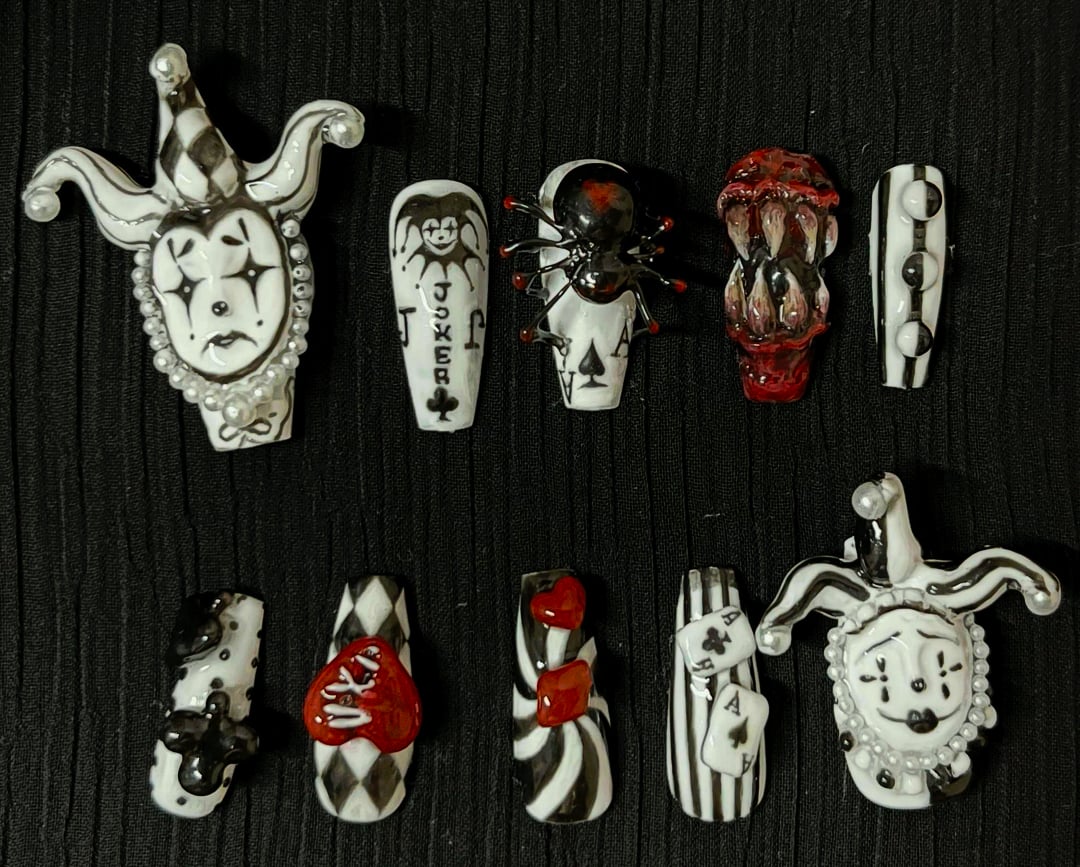 Pierrot nails for my halloween costume this year! The spider one + the spirals def could’ve used some more work but given the time constraint super happy with how everything turned out, esp the clowns. I’ve been wanting to get more practice with 3d gels so this was perfect, might do a spider set just to get more comfortable making the legs ♥️♦️