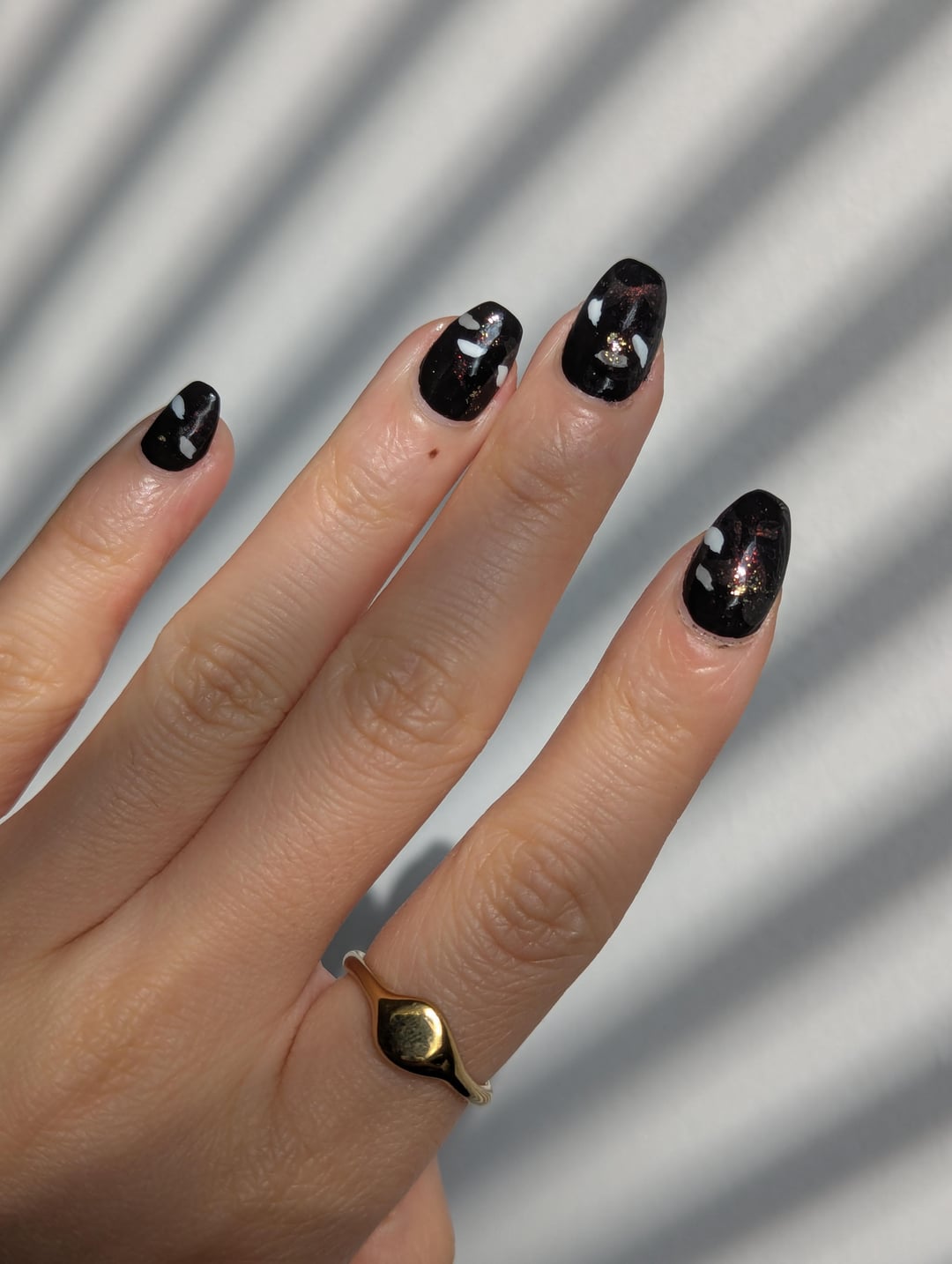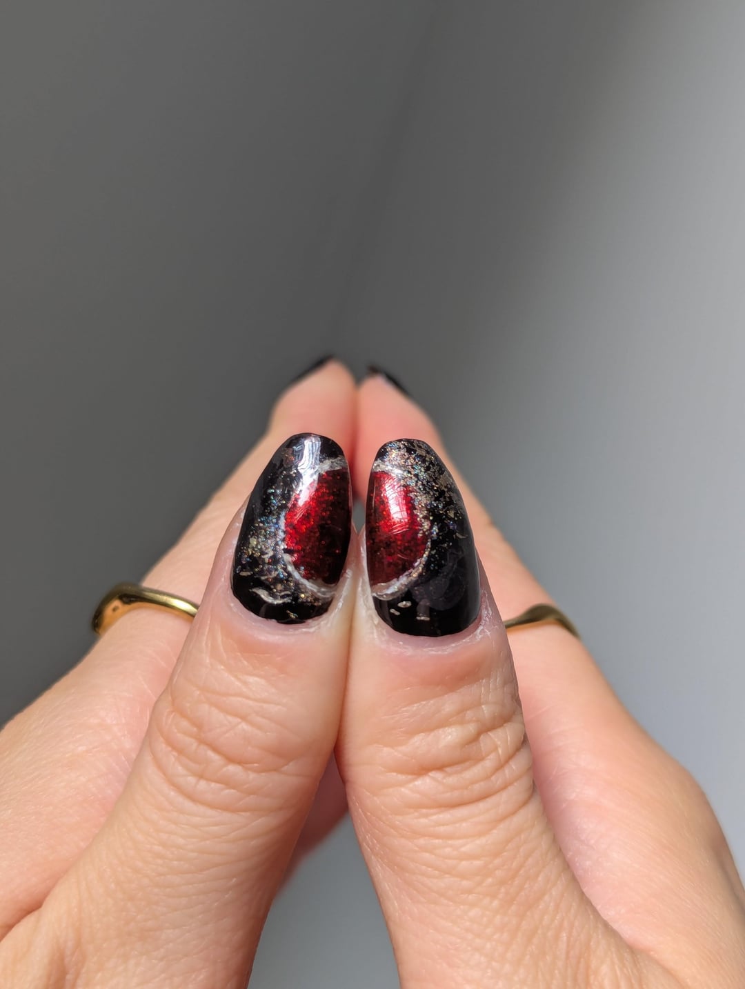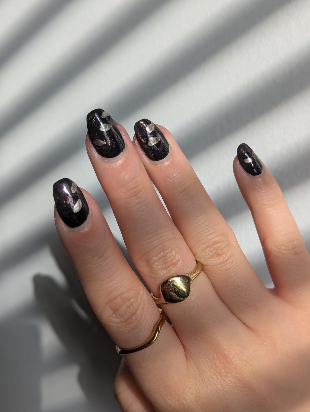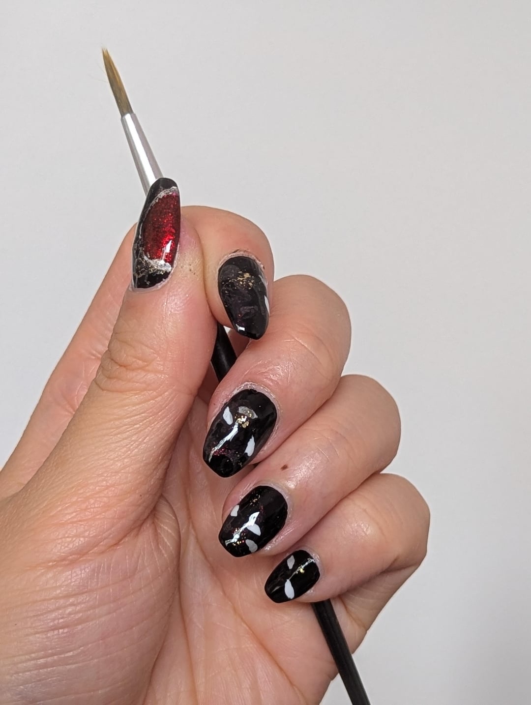 LividKiwi on October 30, 2025 7:22 am nail art inspired by clair obscur: expedition 33 – i just HAD to pay homage to this incredible game. iykyk for those who’ve finished 😭😭😭😭 product list: – mooncat – emo for life – mooncat – like a moth to a flame – mooncat – fake halo – mooncat – the arsonist – holo taco – gold flake taco – holo taco – not milky white (left hand 🥀) – supwee – metallic gold (right hand 🥀) – essie – ink jelly – 2 thicc coats seche vite