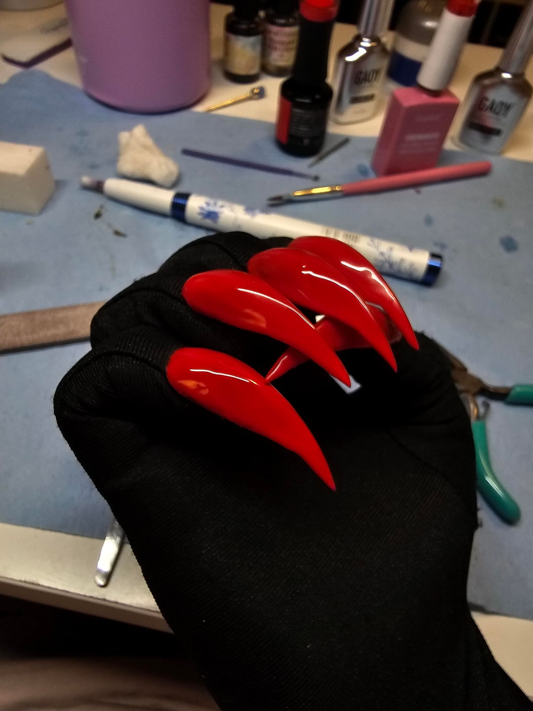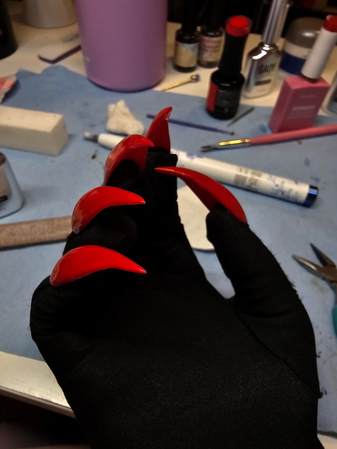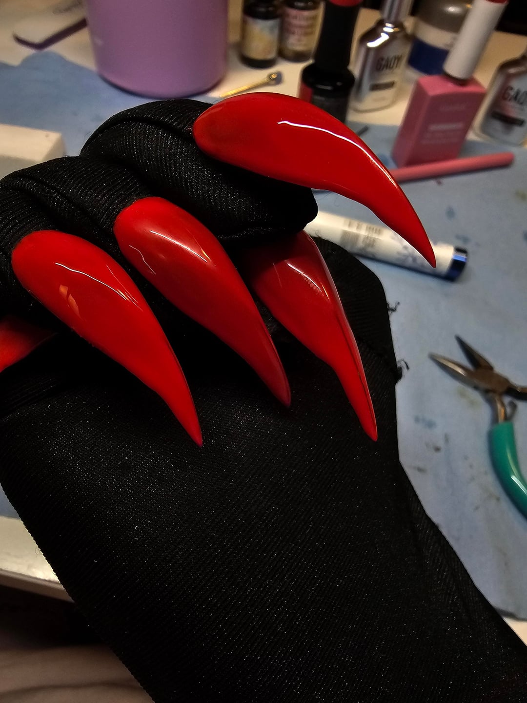 My son is being alastor for Halloween, he asked me to do nails for him for his costume exactly like alastors. Hes been real picky and ive been doing these and trying different styles non of which he liked until I did these and he said he loves them. I tried really hard I don't think they look exactly like alastors but he's happy with them and I'm just a basic nail tech so these were quite hard to portray.