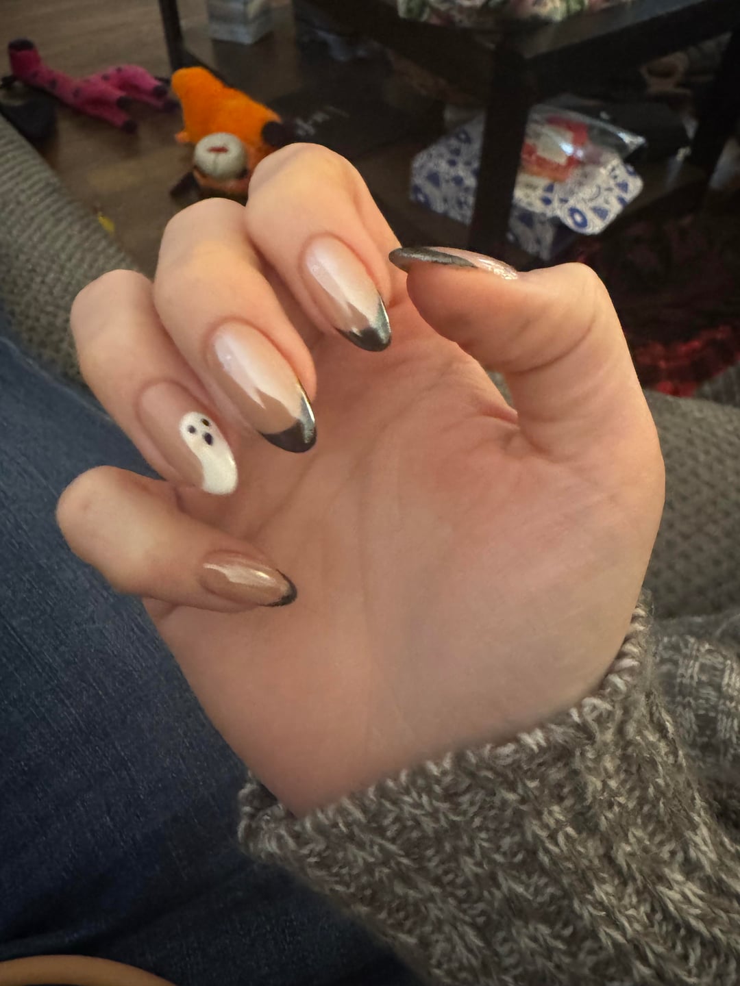 Medium almond. Black French tip with pearl chrome. Designs on ring fingers.