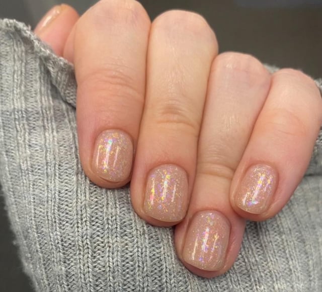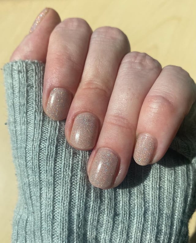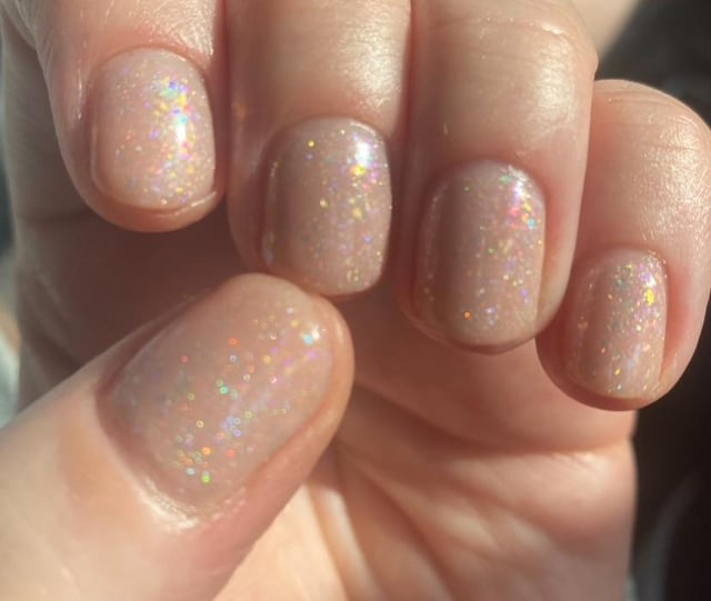 I was still enamored with the idea of a sparkly nude. I decided to try to create a version of Sandy Baby that would work for me. Cirque's Rose Jelly is close to my ideal "your nails but better" nude, and that became my base. Holo Taco's Everything Taco is a topper that absolutely screams HELLO IT'S SPARKLE TIME, and layering Cirque's Peach Jelly over that toned everything down enough to give the mani some subtlety.