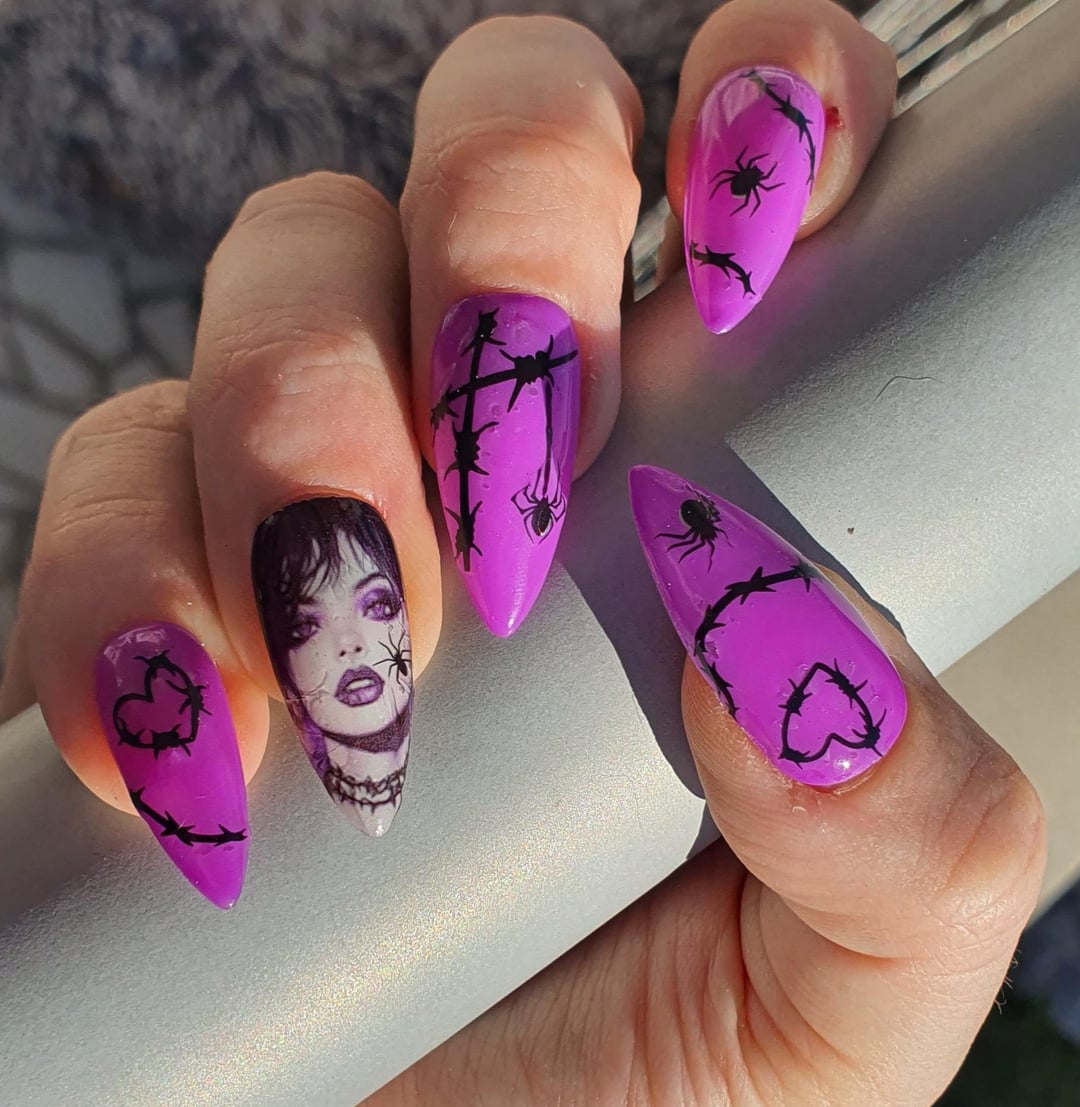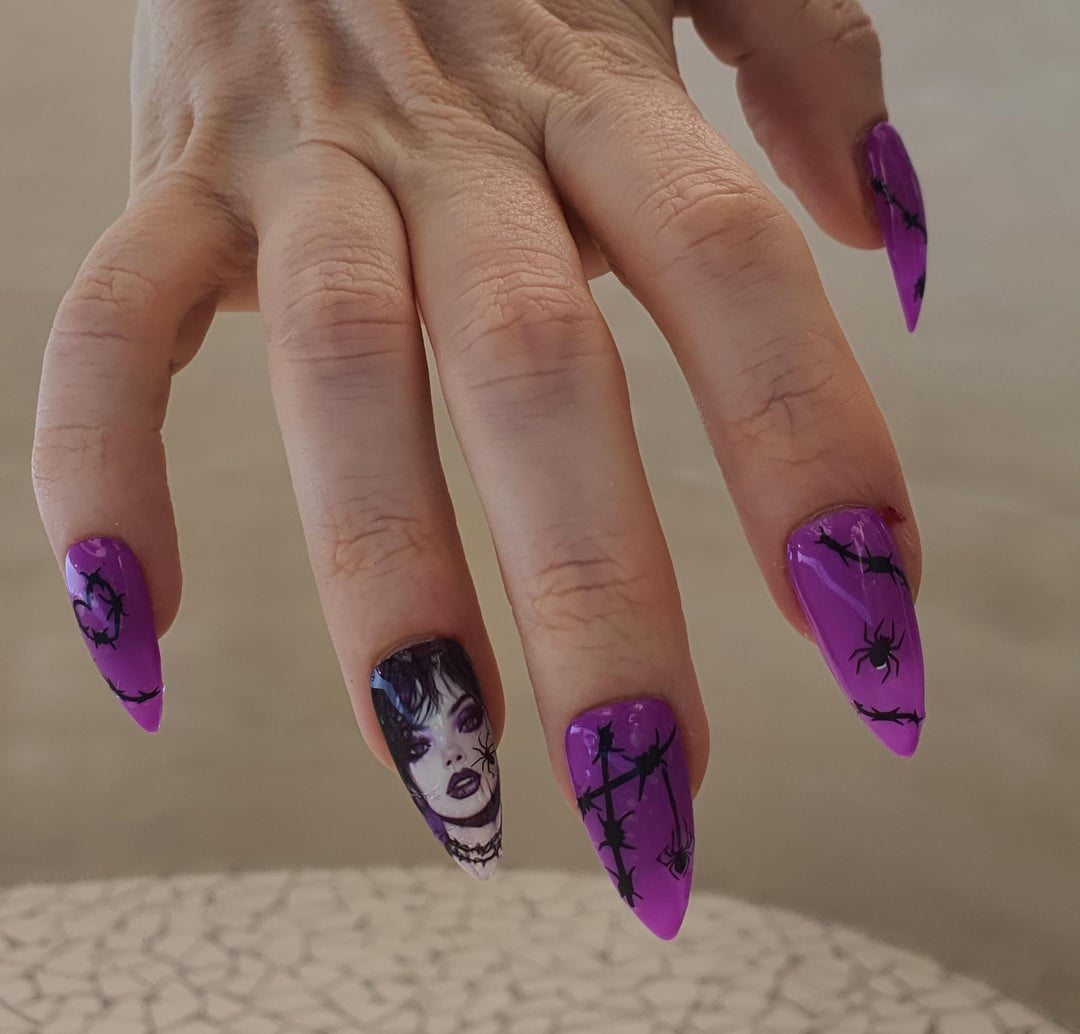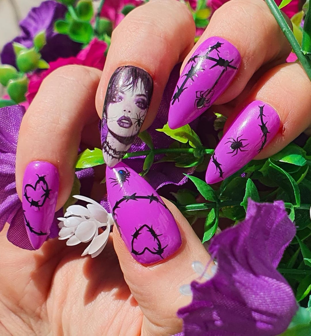For this set, I used : – purple gel polish – homemade decal for the ring finger – barbel wires and spider stickers Glossy top coat I would add some spike studs and black piercings for a more edgy vibe by Key_Opportunity_7082