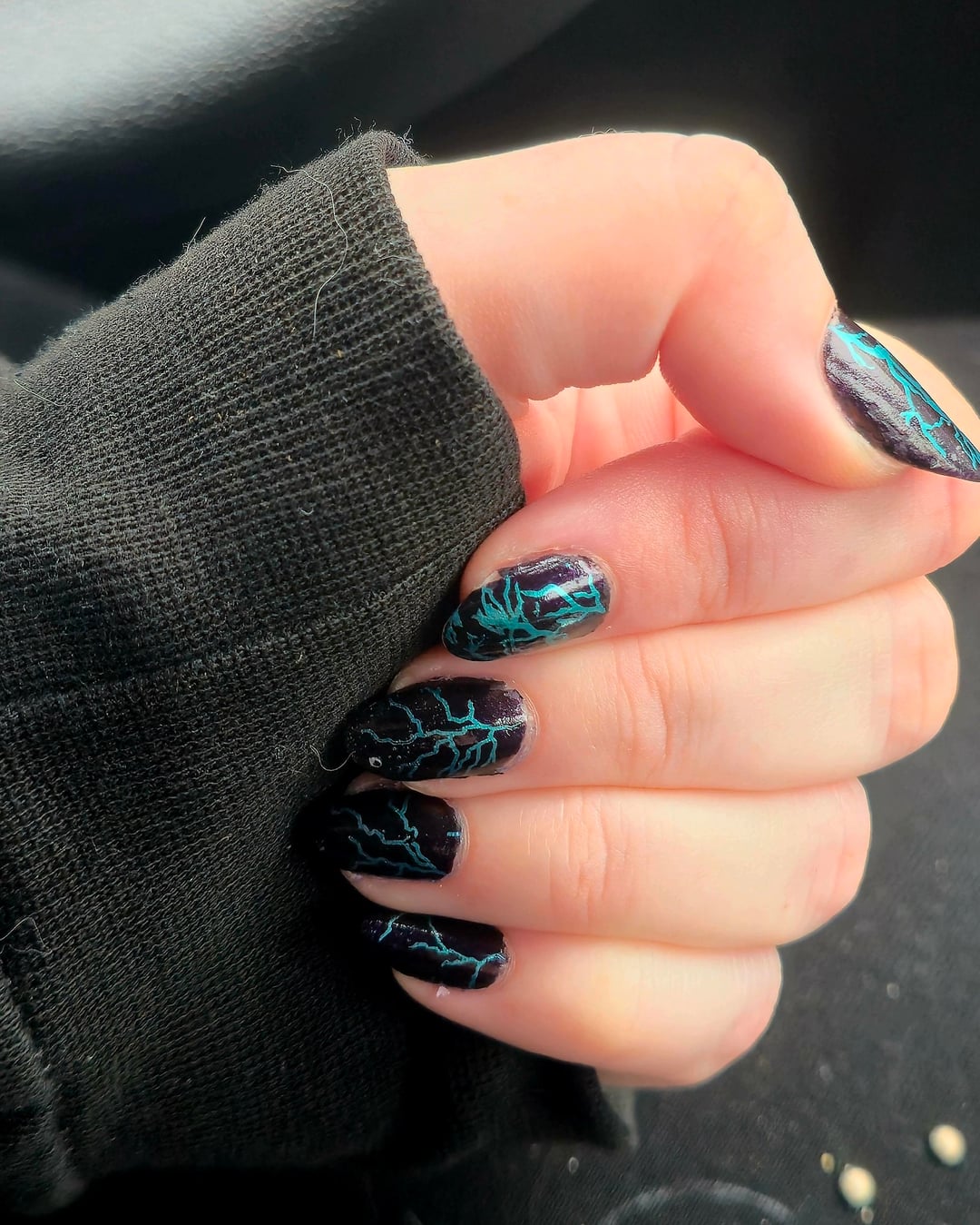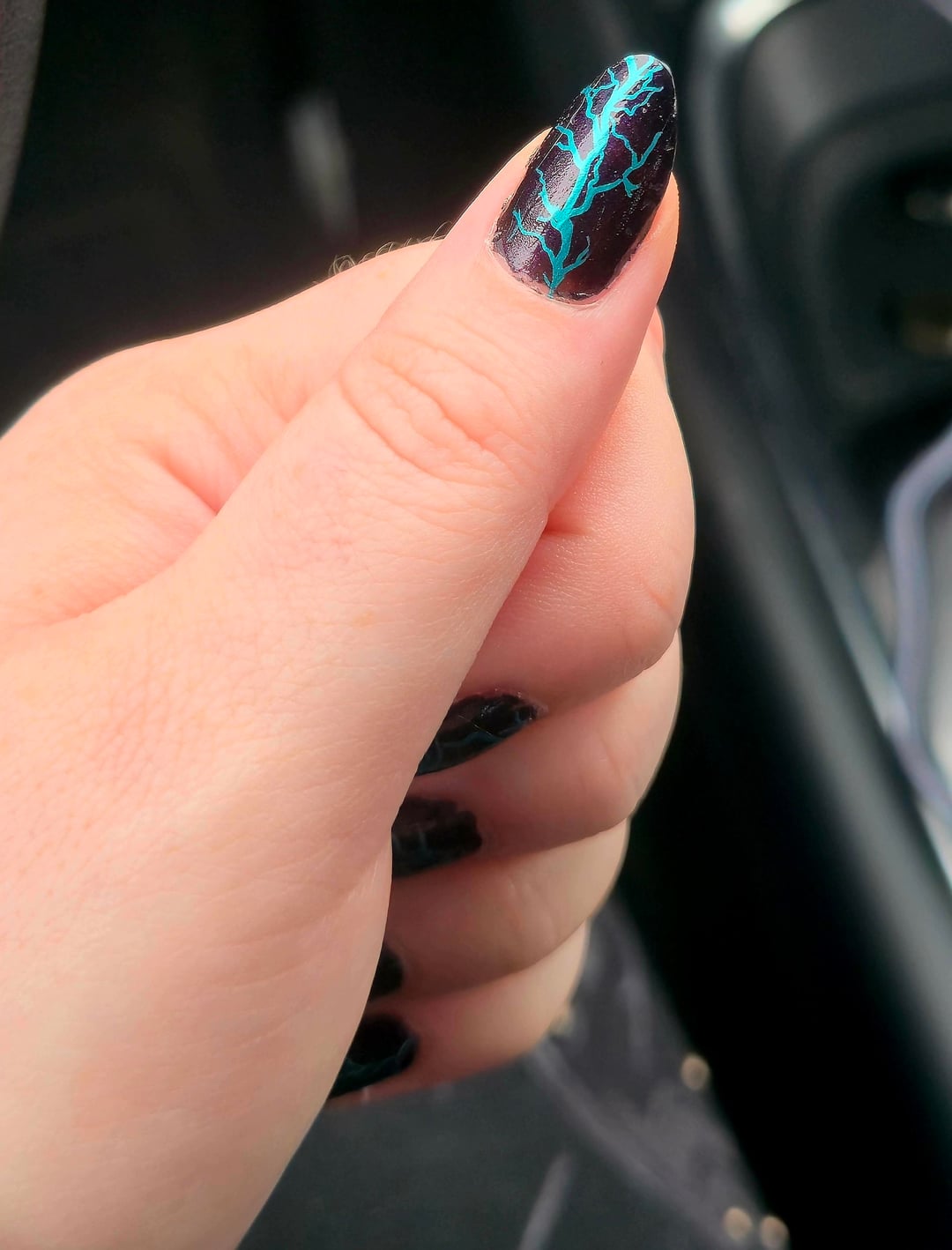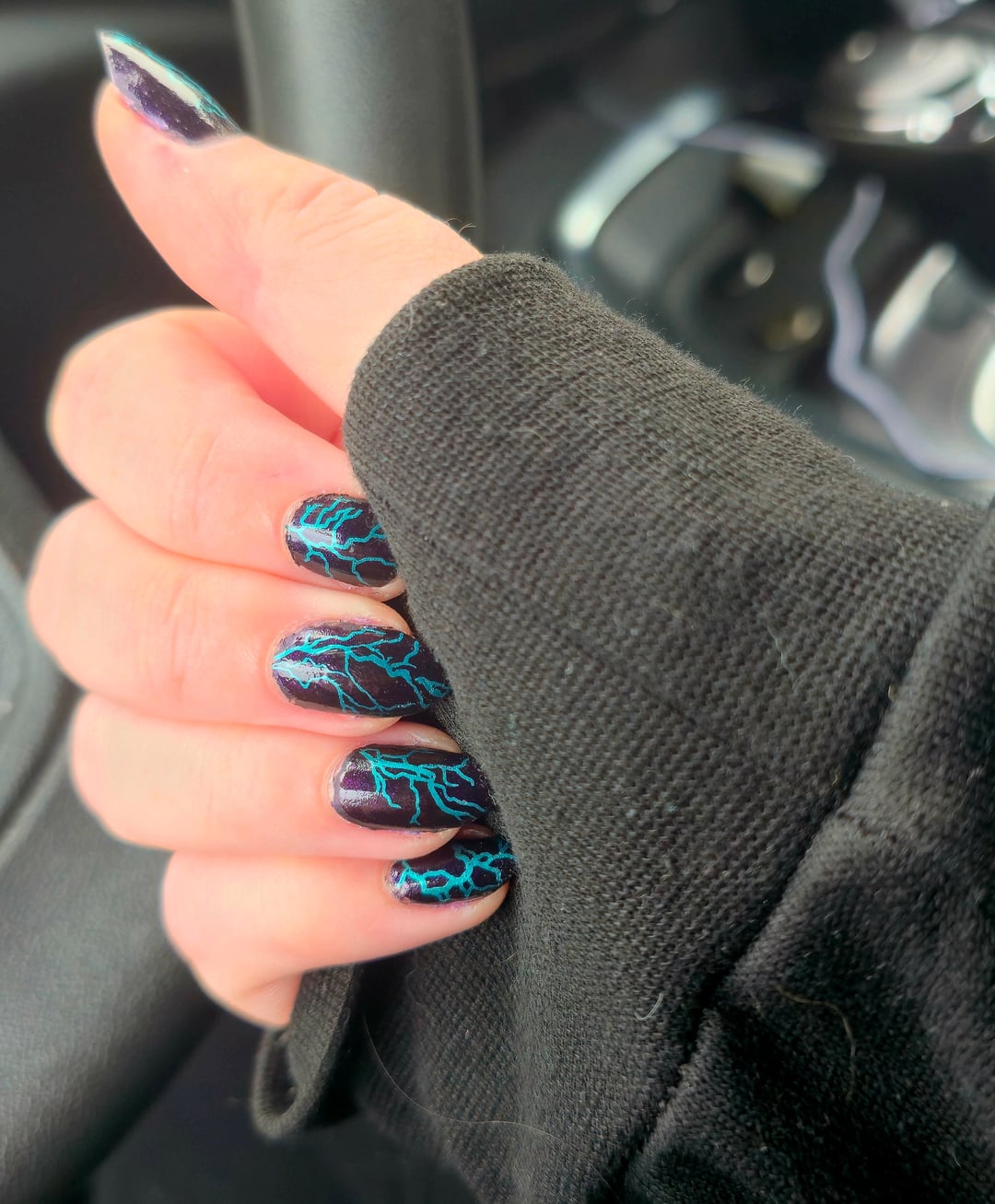 But for my first stamping mani I've gone with a representation of a character I write for! Her theming is purple and teal/cyan and has, you guessed it, lightning powers lolol