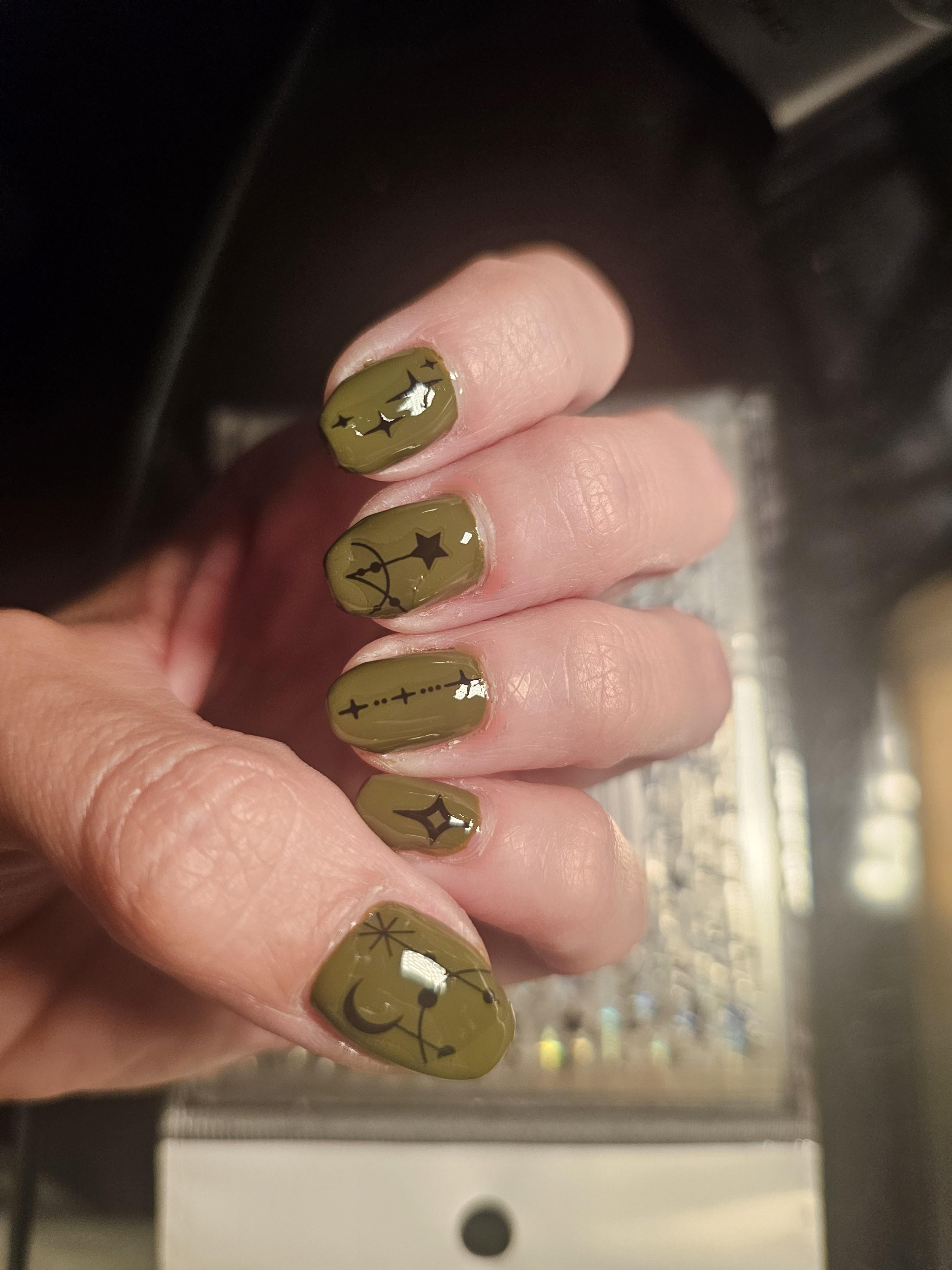 Trying out nail stickers, wearing 2 coats of Mooncat’s The Stranger with Essie gel setter top coat. by petsplantscamps